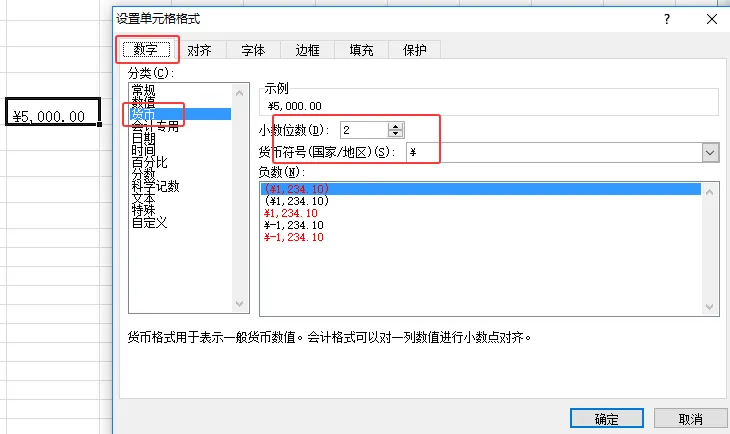 例:在工资表中,“5000”设置为“人民币货币格式”,显示为“¥5,000.00”。