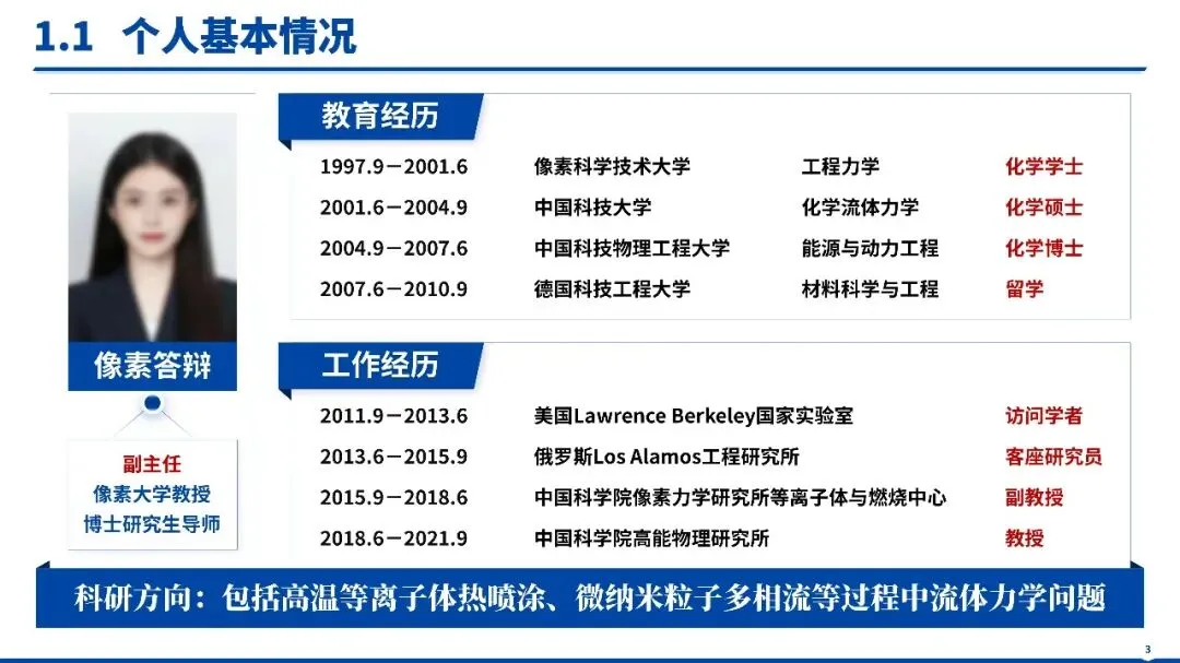 开篇直击等离子喷涂雾化动力研究核心瓶颈(如等离子射流与粉末颗粒相互作用机理不明、雾化过程稳定性与均匀性不足、涂层质量精准控制技术瓶颈),以 “多相流耦合动力学理论 - 高精度雾化过程调控技术” 为桥定靶向;中段按 “个人基础 - 学术突破 - 支撑条件” 递进讲成果;结尾升华为表面工程领域 “理论 - 技术 - 工艺 - 应用” 新范式,形成 “问题 - 突破 - 延展” 完整逻辑链。