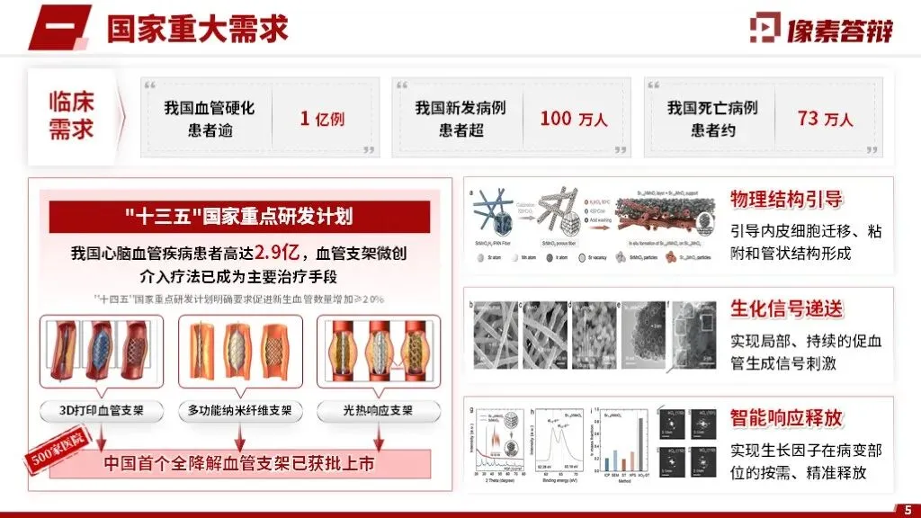 PPT采用“重大需求-科学问题-创新技术-应用效益”递进框架,以血管化瓶颈为切入点,贯穿仿生支架设计、智能响应释放、在体成像等核心技术,形成从基础研究到医疗器械注册的完整转化链条。