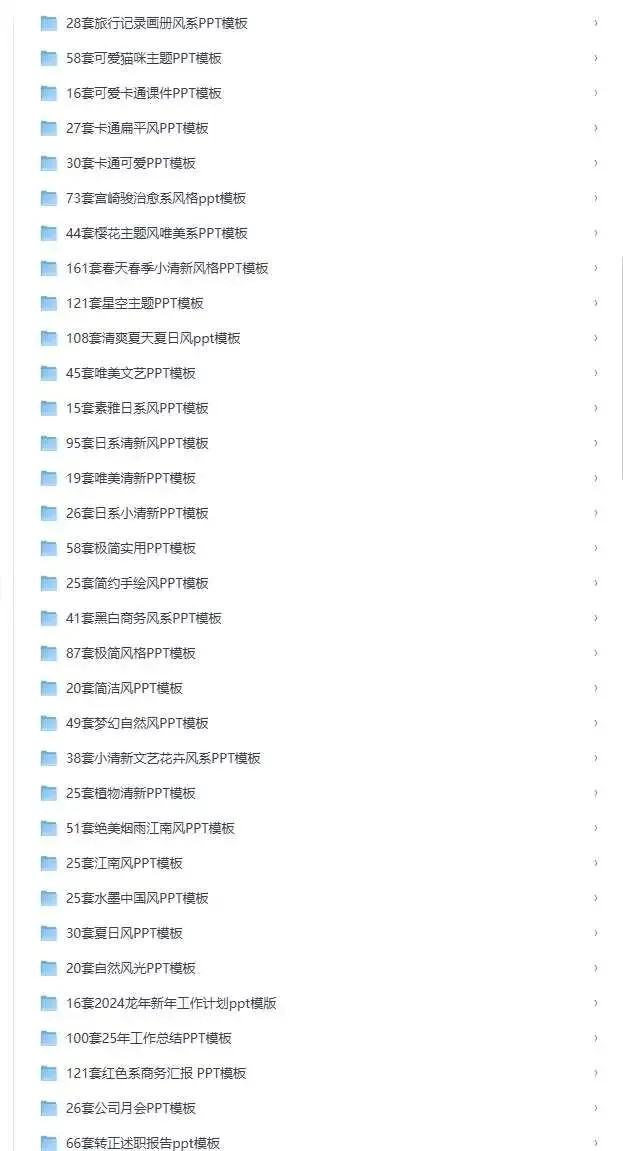 - 季节与节点类:161套春天春季小清新风格PPT模板、108套清爽夏天夏日风ppt模板、20套2024龙年新年工作计划ppt模板、100套25年工作总结PPT模板,满足季节活动、年度计划的演示需求。