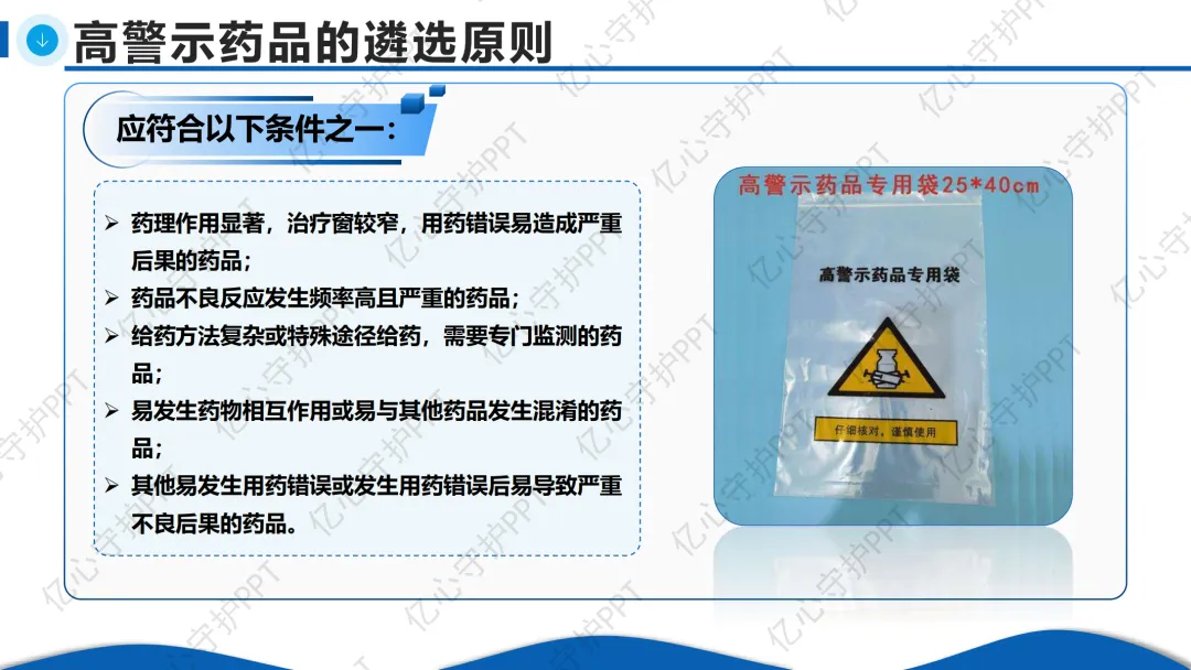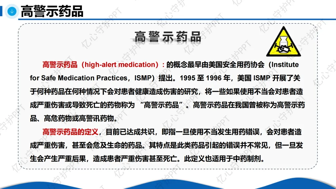 高警示药品(High-Alert Medications)是指那些药理作用显著、治疗窗窄、易发生用药错误,且错误后果严重的药物。这个概念最早由美国安全用药协会提出,现已在我国医疗管理中广泛应用。