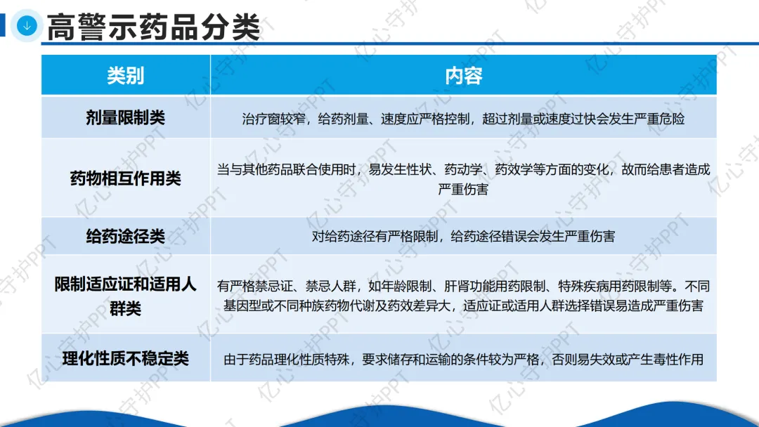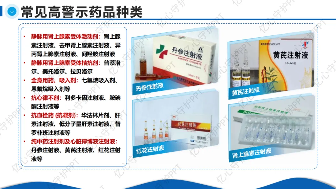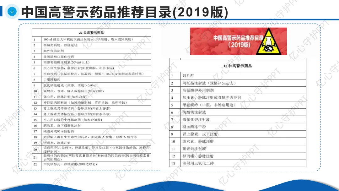 我国在2019年发布了《中国高警示药品推荐目录》,将高警示药品分为22大类及13种具体药品,常见包括: