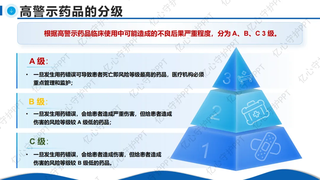 根据用药错误可能导致的伤害程度,高警示药品被分为A、B、C三级: