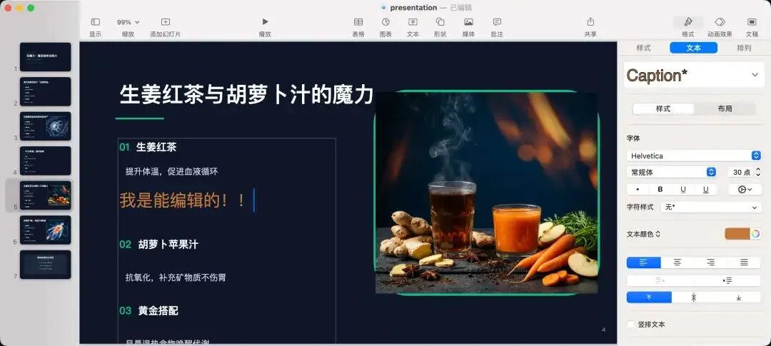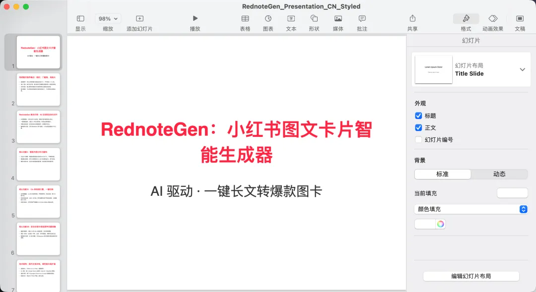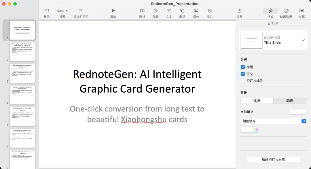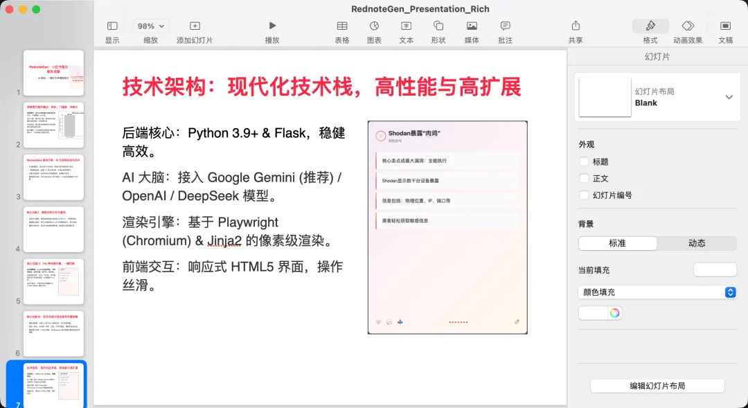 以上 PPT,可不是 NanoBanana 生成的静态图片。这套方案生成的 PPT 文件,在微软PowerPoint/苹果Keynote里,随时编辑修改。