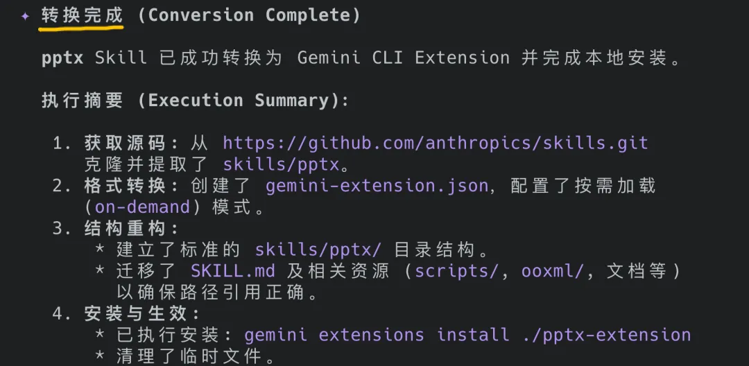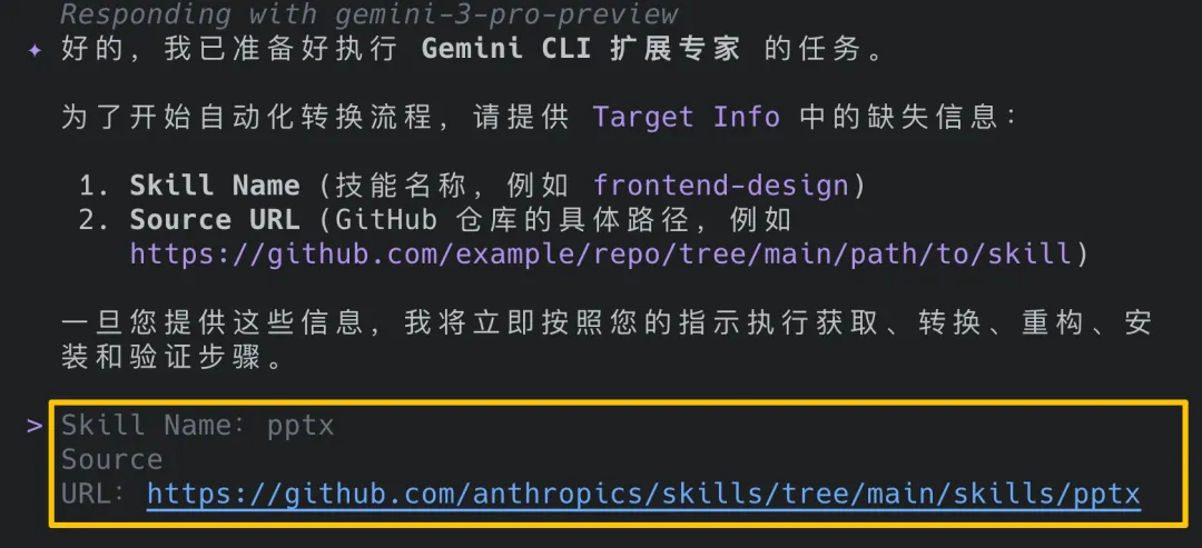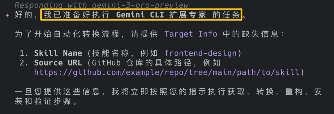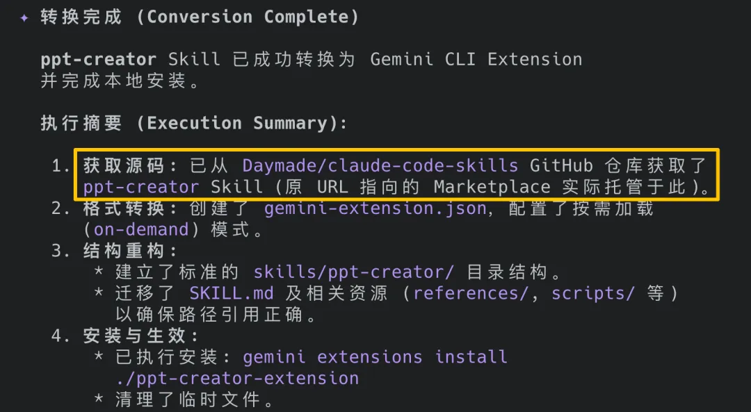 本质上,Skills Marketplace 是个集合站,Gemini CLI 会聪明地解析这个 Skill 的GitHub源地址,然后就照搬不误了。