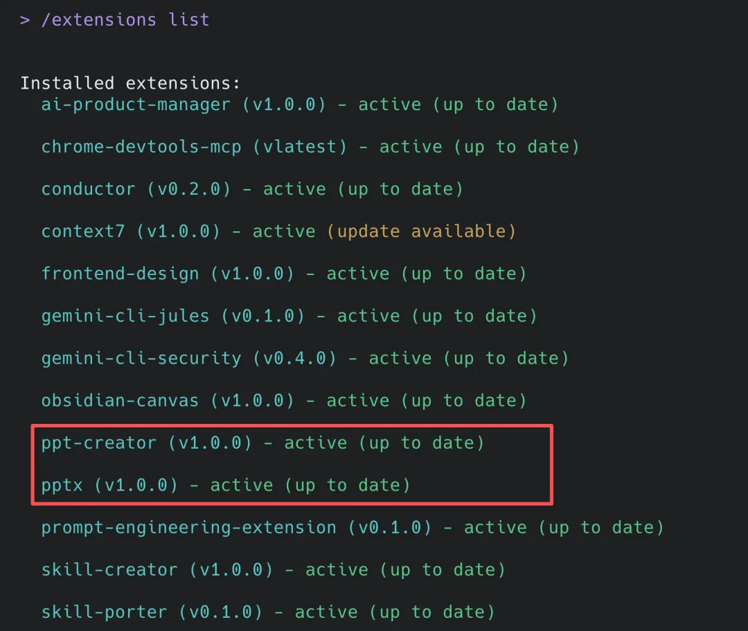第 3 步,开启:重启 CLI,执行/extensions list确认。