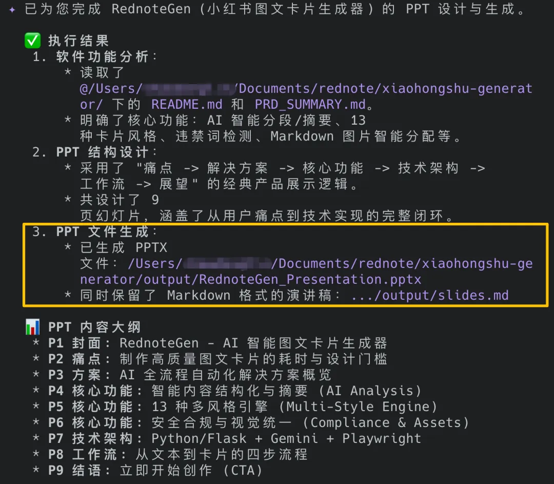 很简单,输入主题,让 PPT Creator 设计, PPTx Skill 生成。