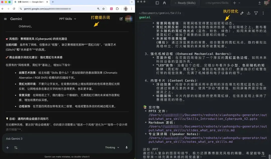 左边 Gemini 打磨提示词,右边 Gemini CLI 执行优化。