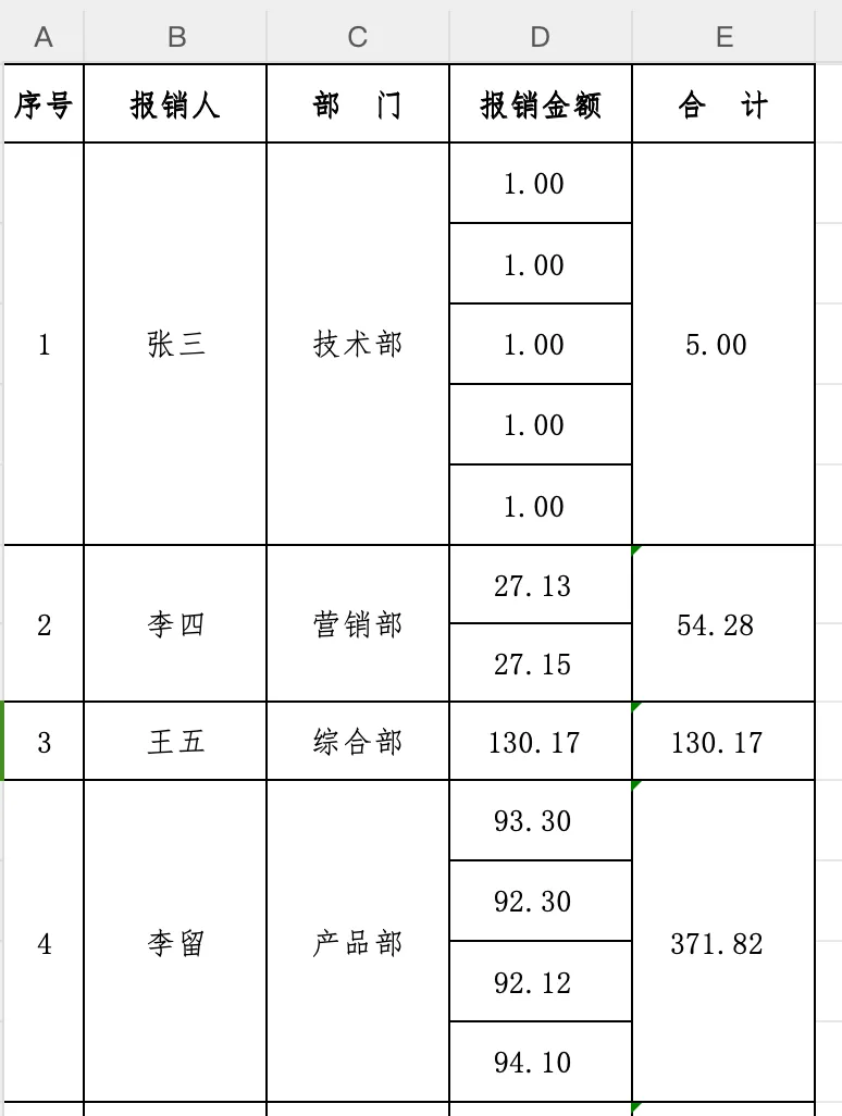 目标是:在E列的每个合并单元格中,快速求出对应B列人员所有D列金额的总和。