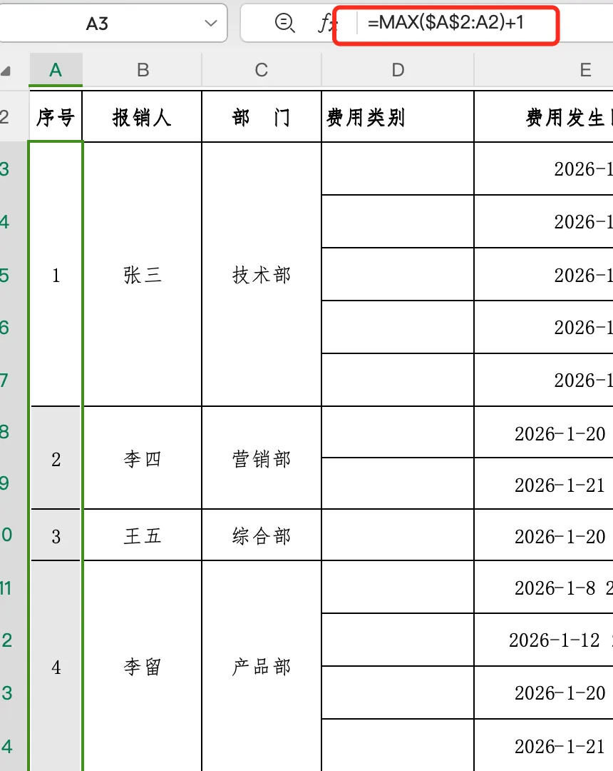 这种方法适用于序号从1开始,并且左侧有固定表头(如“序号”)的情况,它能自动忽略已合并的区域。