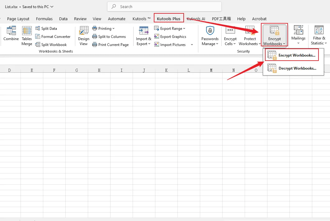 1、安装Kutools插件,点击【KUTOOLS PLUS】,选择【加密工作簿】。