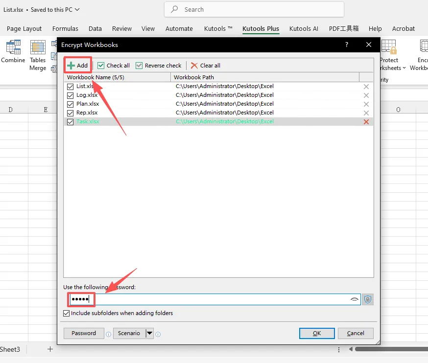 2、点击【添加】,将需要设置打开密码的Excel文件全部加进来,在下面填写密码,最后点击【确定】,所有Excel就加密完成了。