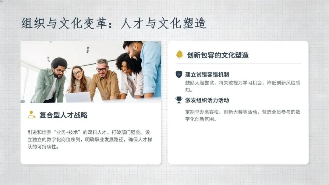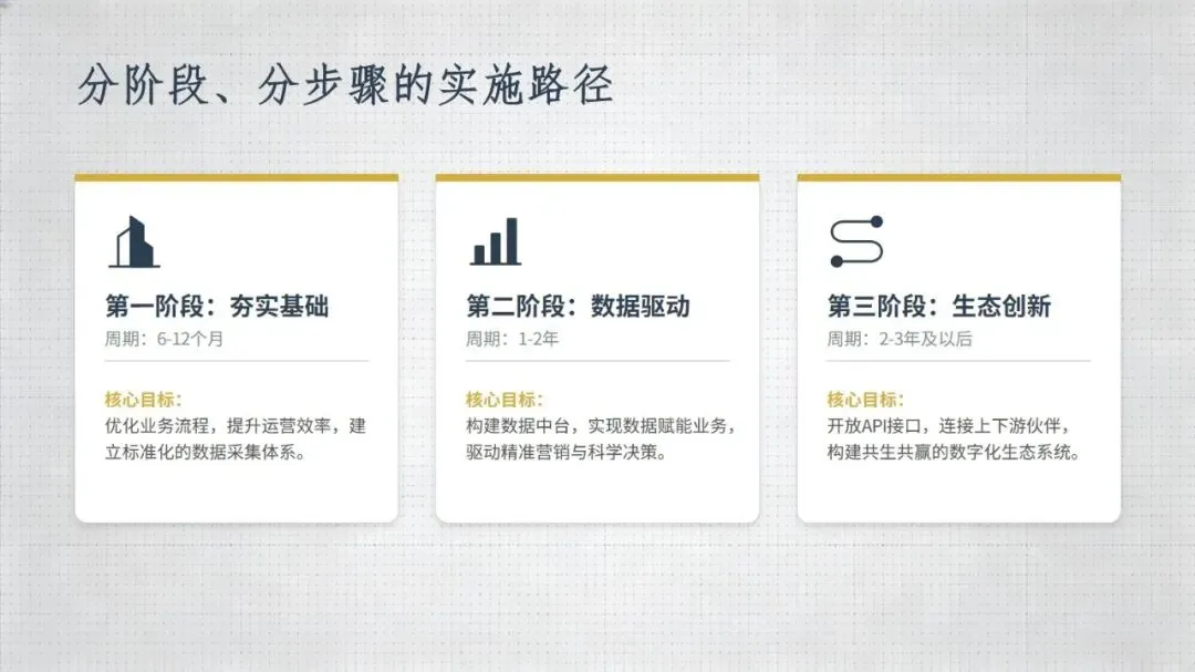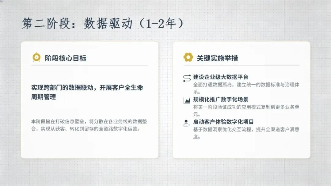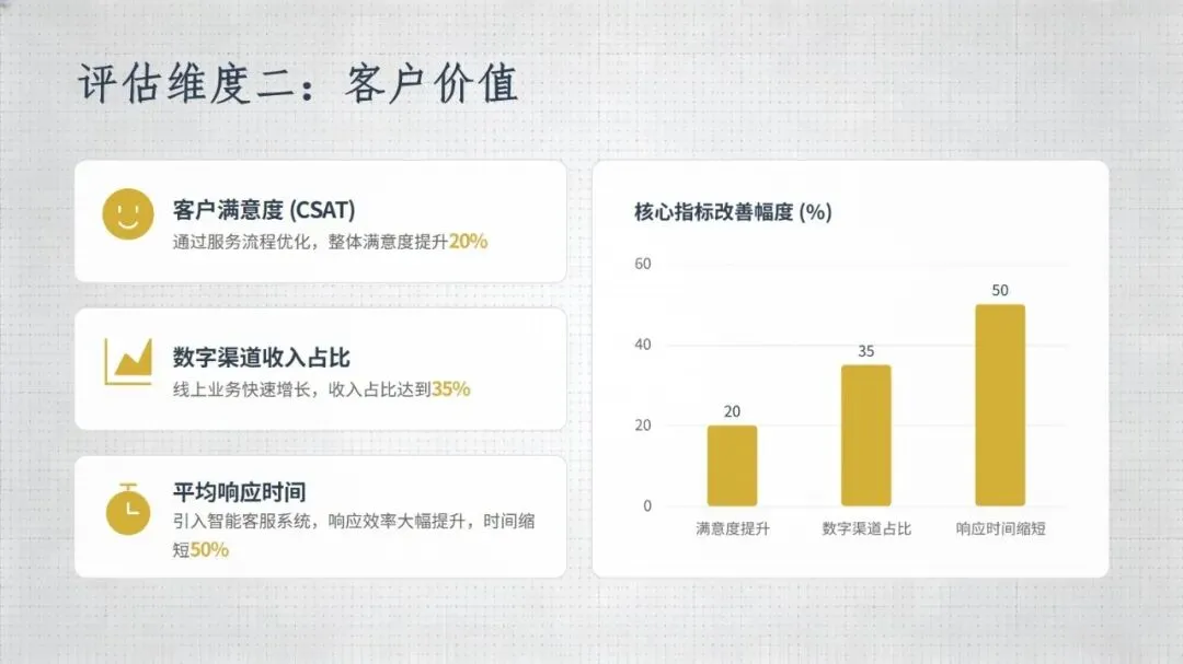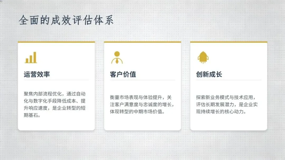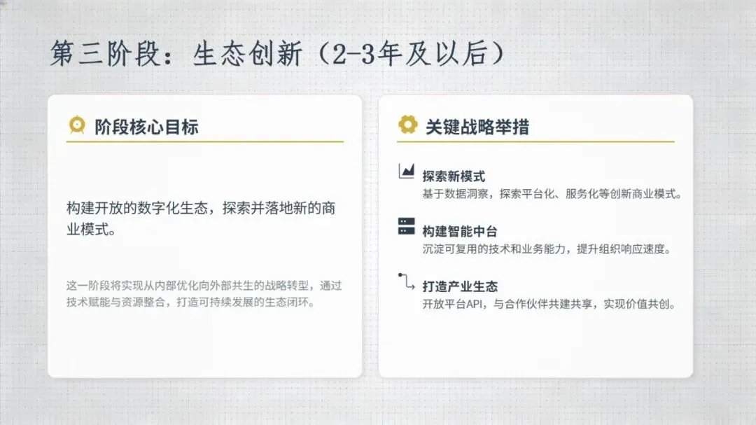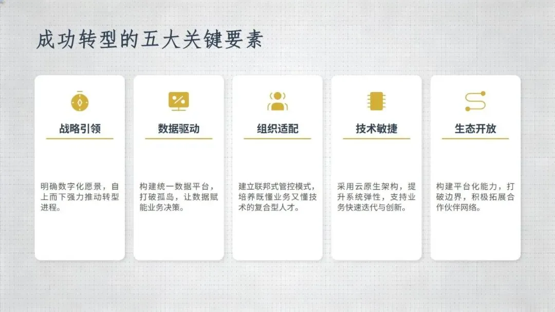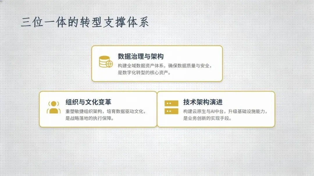 支撑体系方面,确定了联邦式管控模式,构建 “产品中心 + 交付中心 + 创新中心” 的数字化组织,强化数据治理与复合型人才培养,采用云原生、微服务等灵活技术架构保障转型落地。按照规划,通过多阶段有序投入,预计可实现运营效率提升 10% 以上、成本缩减 10%-20%、客户服务水平提升 7% 以上的实际成效。