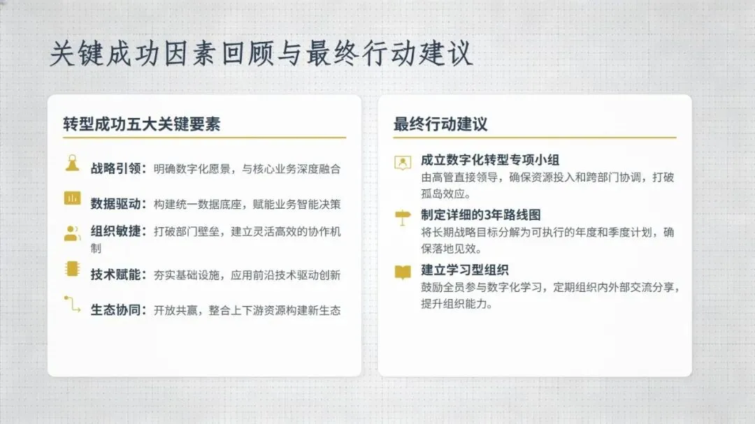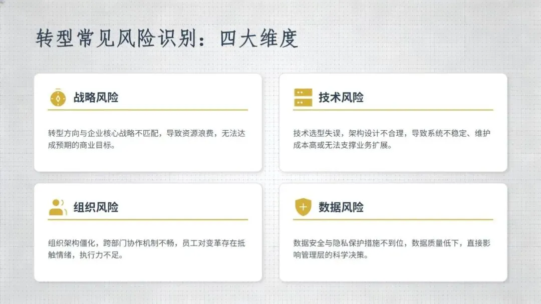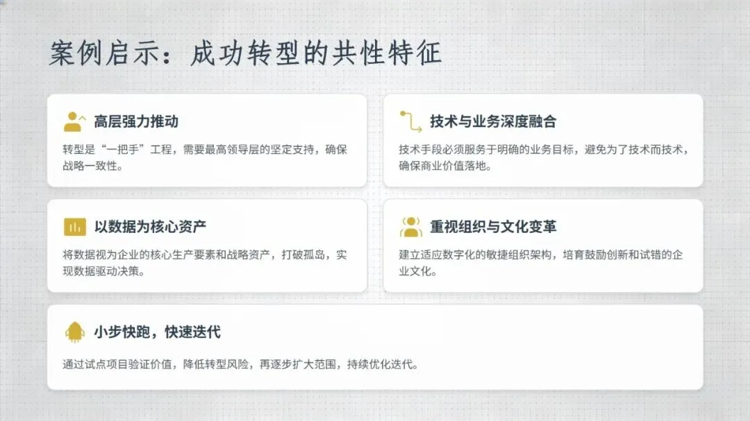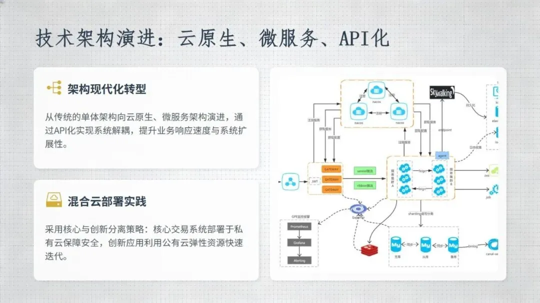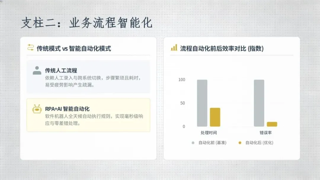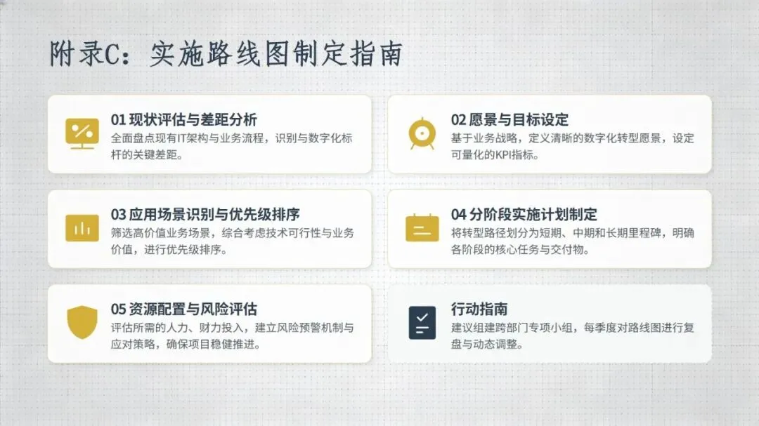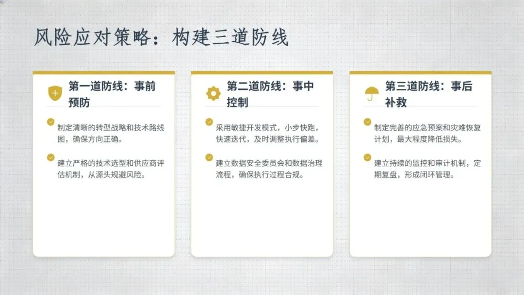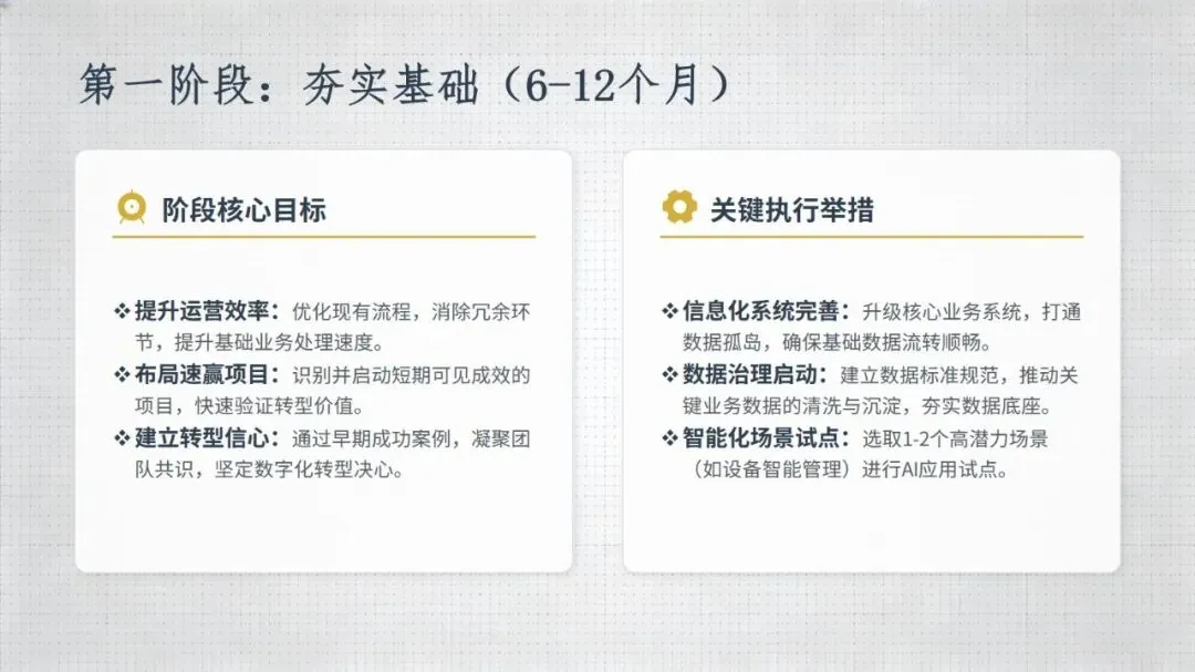 支撑体系方面,确定了联邦式管控模式,构建 “产品中心 + 交付中心 + 创新中心” 的数字化组织,强化数据治理与复合型人才培养,采用云原生、微服务等灵活技术架构保障转型落地。按照规划,通过多阶段有序投入,预计可实现运营效率提升 10% 以上、成本缩减 10%-20%、客户服务水平提升 7% 以上的实际成效。