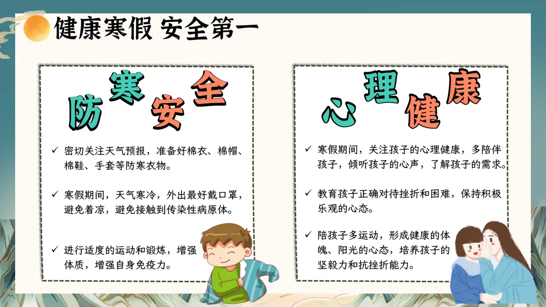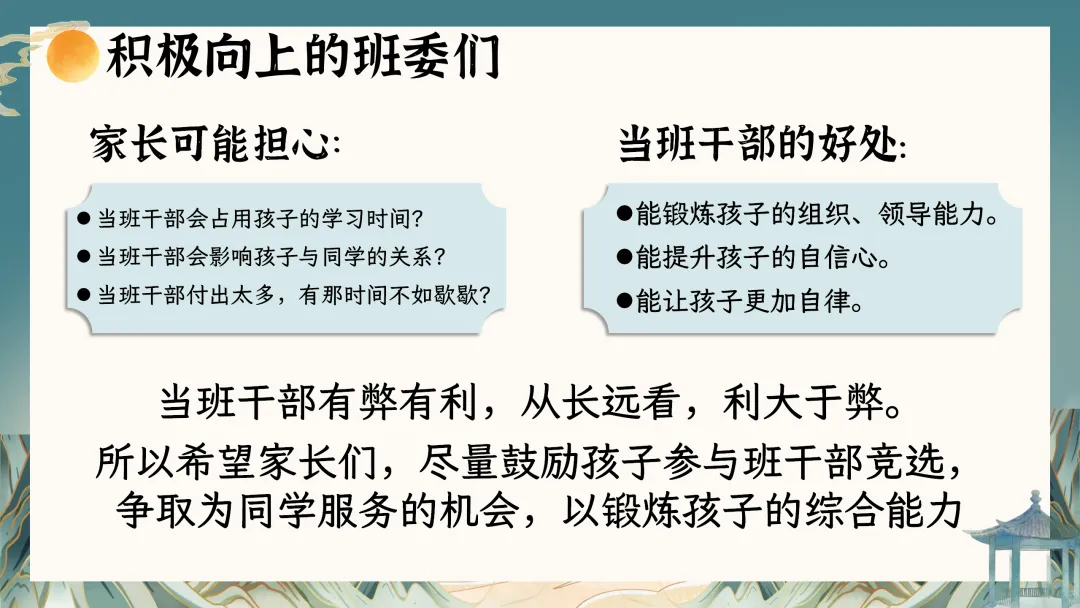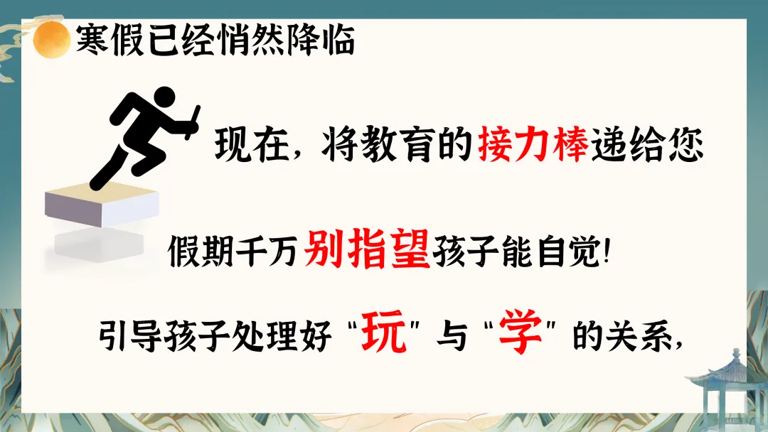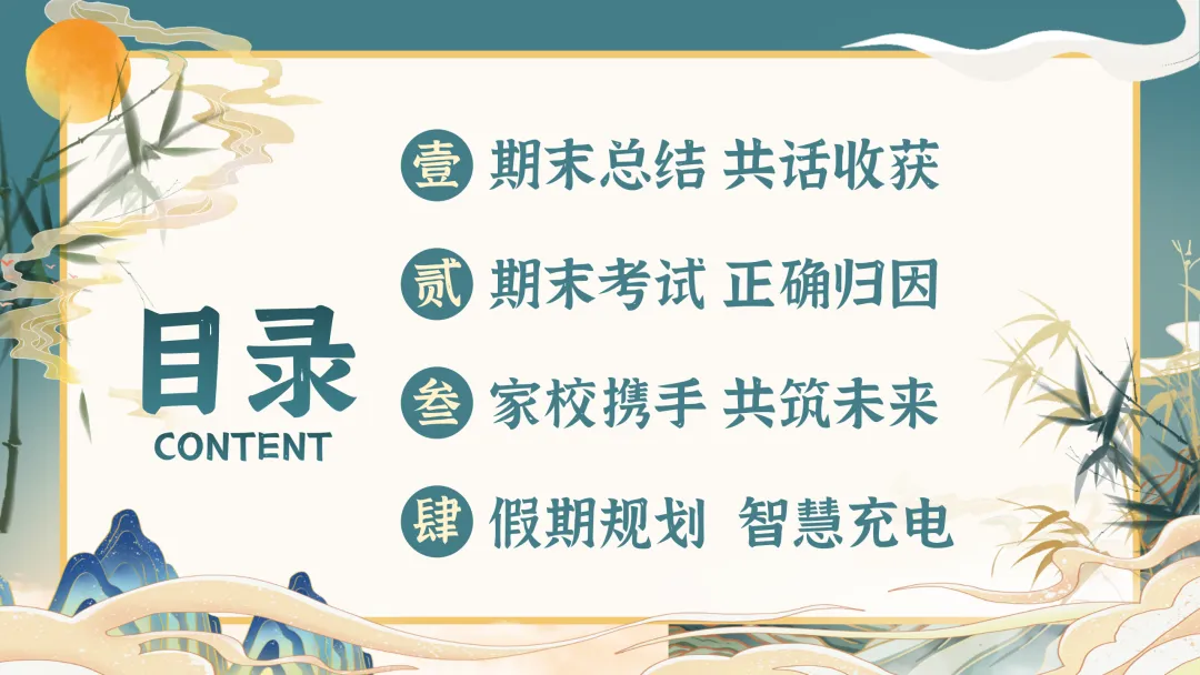 本次家长会内容分4部分进行:1期末总结 共话收获;2期末考试 正确归因;3家校携手 共筑未来;4假期规划 智慧充电。