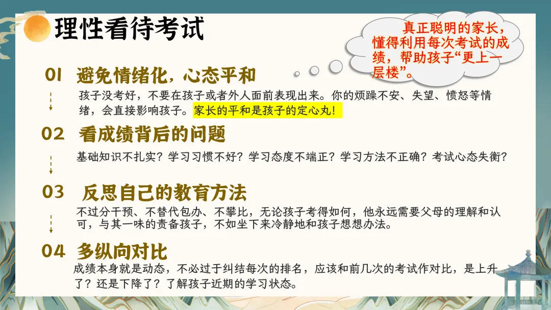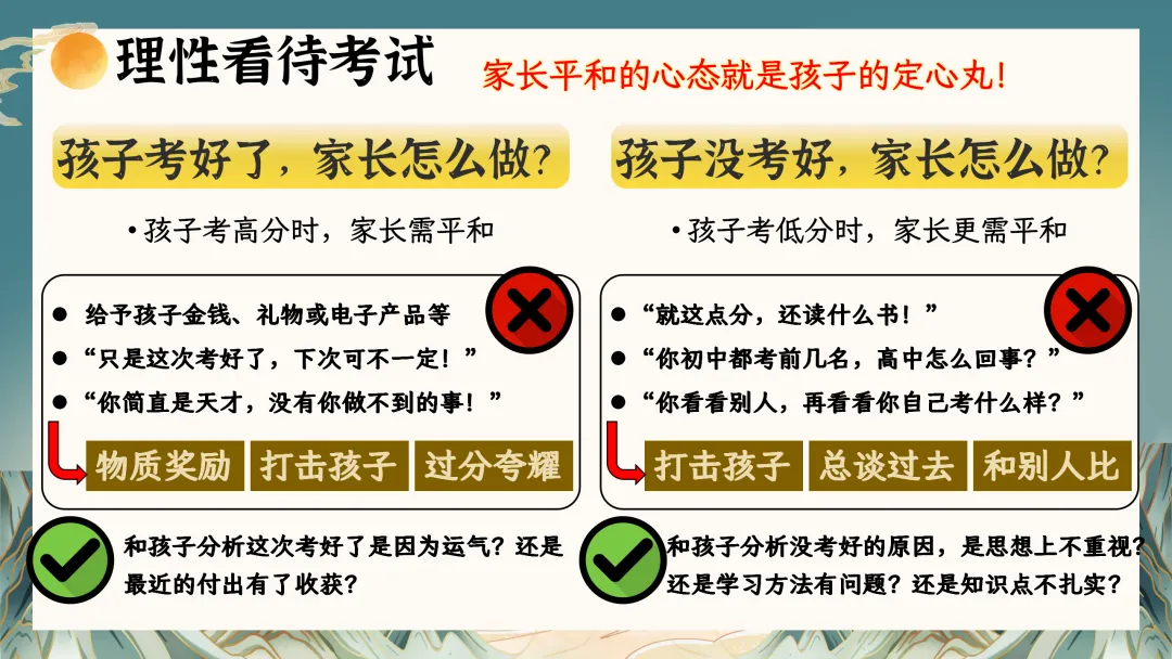 不要盲目攀比、放任不管、过度期望;要心平气和、激发内驱力、优化学习方法。