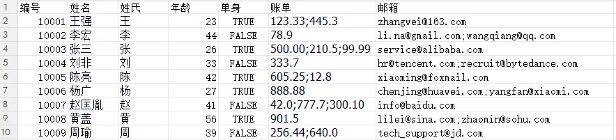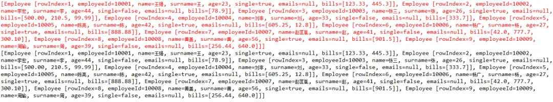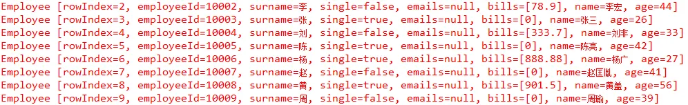 Employee [rowIndex=1,employeeId=10001,surname=王,single=true,emails=null,bills=[123.33, 445.3],name=王强,age=23]