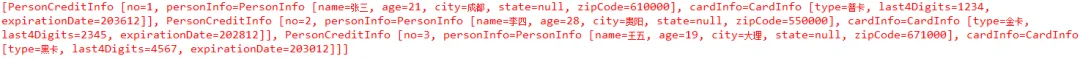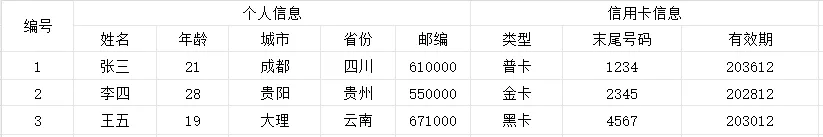 @ExcelSheet("Sheet2")public class PersonCreditInfo {@ExcelCellName("编号")private Integer no;@ExcelCellRangeprivate PersonInfo personInfo;@ExcelCellRangeprivate CardInfo cardInfo;public static class PersonInfo {@ExcelCellName("姓名")private String name;@ExcelCellName("年龄")private Integer age;@ExcelCellName("城市")private String city;@ExcelCellName("国家")private String state;@ExcelCellName("邮编")private String zipCode;}public static class CardInfo {@ExcelCellName("类型")private String type;@ExcelCellName("末尾号码")private String last4Digits;@ExcelCellName("有效期")private String expirationDate;}}