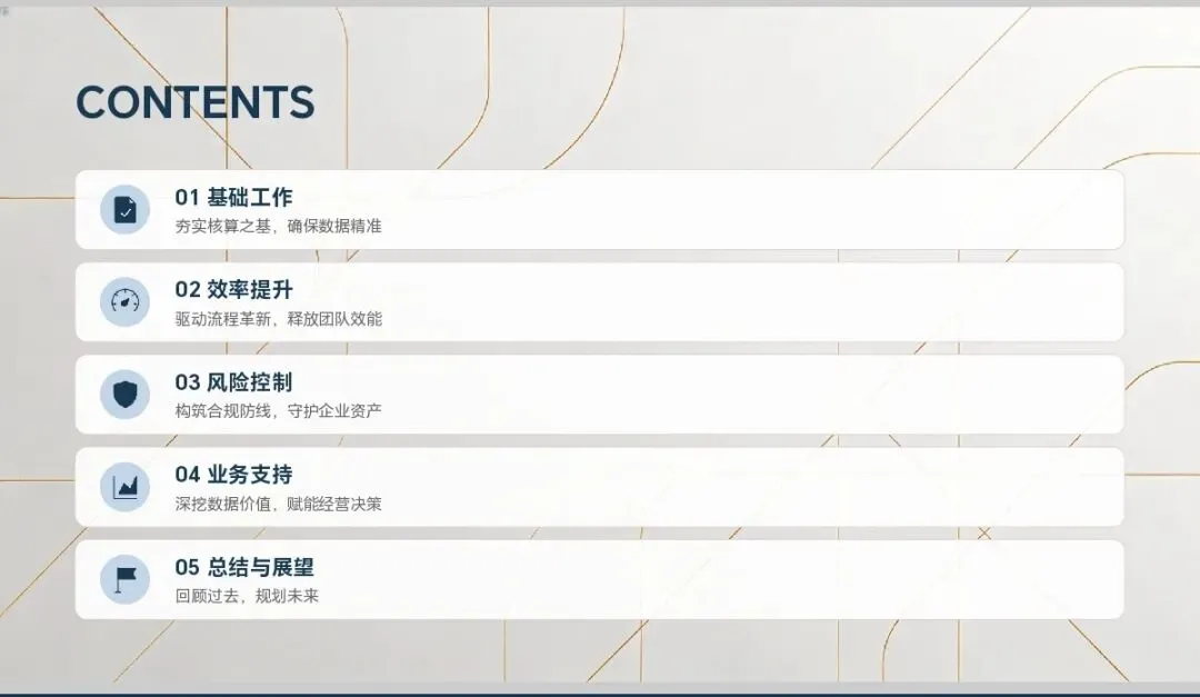 过去一年,我始终以“夯实数据基石、筑牢风控防线”为核心目标,在完成核算本职工作的同时,主动链接业务、优化流程,努力让核算工作成为公司稳健运营的“压舱石”、高效决策的“导航仪”。