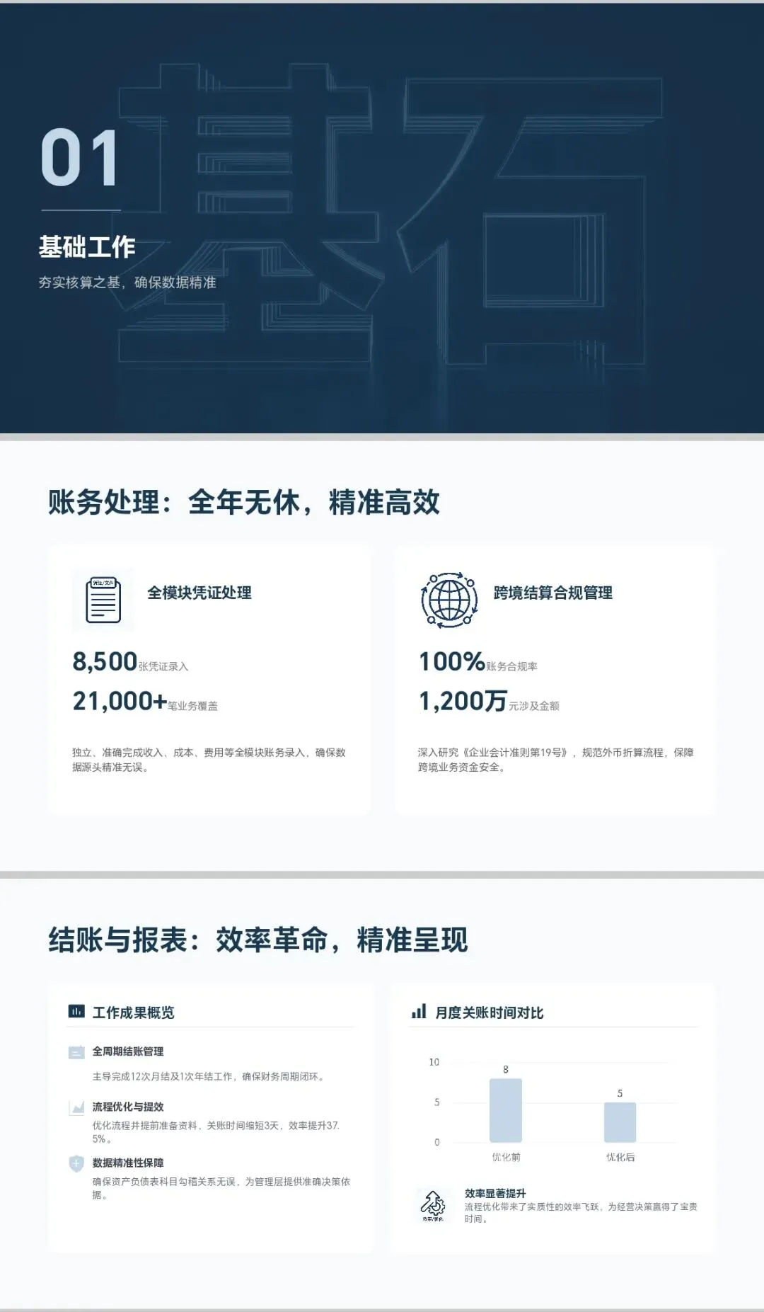 核算工作是财务工作的源头,精准性是第一生命线。2025年,我独立完成3200张记账凭证录入,覆盖公司收入、成本、费用、资产等全业务模块,涉及8600笔经济业务,凭证准确率保持100%。尤其在第四季度公司跨境设备采购结算业务中,面对外汇波动、关税核算、国际会计准则差异等复杂问题,我深入研究《企业会计准则第19号——外币折算》及跨境贸易相关税收政策,反复核对报关单、信用证、完税凭证等资料,最终实现账务处理零差错,确保了跨境业务财务数据的合规性与准确性。