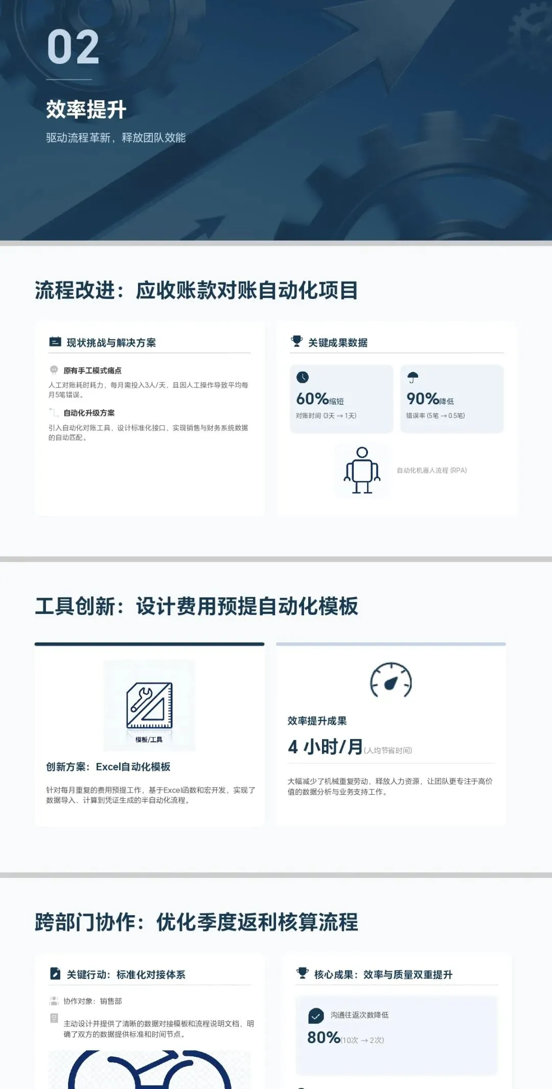 在跨部门协作中,我主动打破“财务孤岛”。配合销售部完成季度返利核算时,我梳理了返利政策细则,设计了清晰的数据对接模板,明确了销售数据提交口径、截止时间及异常反馈流程,将原本需要6次沟通往返的工作,缩短至2次即可完成,全年协助销售部精准核算返利金额128万元,提升了部门协同效率与业务满意度。