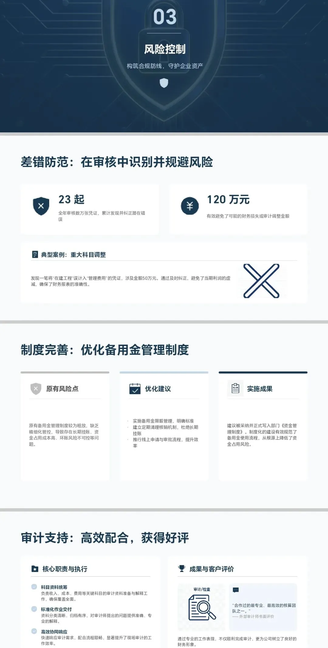 在年度外部审计和季度内部审计中,我负责的成本核算、固定资产等模块,提前整理了完整的凭证、台账、盘点记录等资料,针对审计师提出的16个疑问,均提供了清晰的数据支撑和逻辑解释,确保审计工作顺利推进,获得了审计师“数据详实、核算规范”的好评,也为公司维护了良好的合规形象。