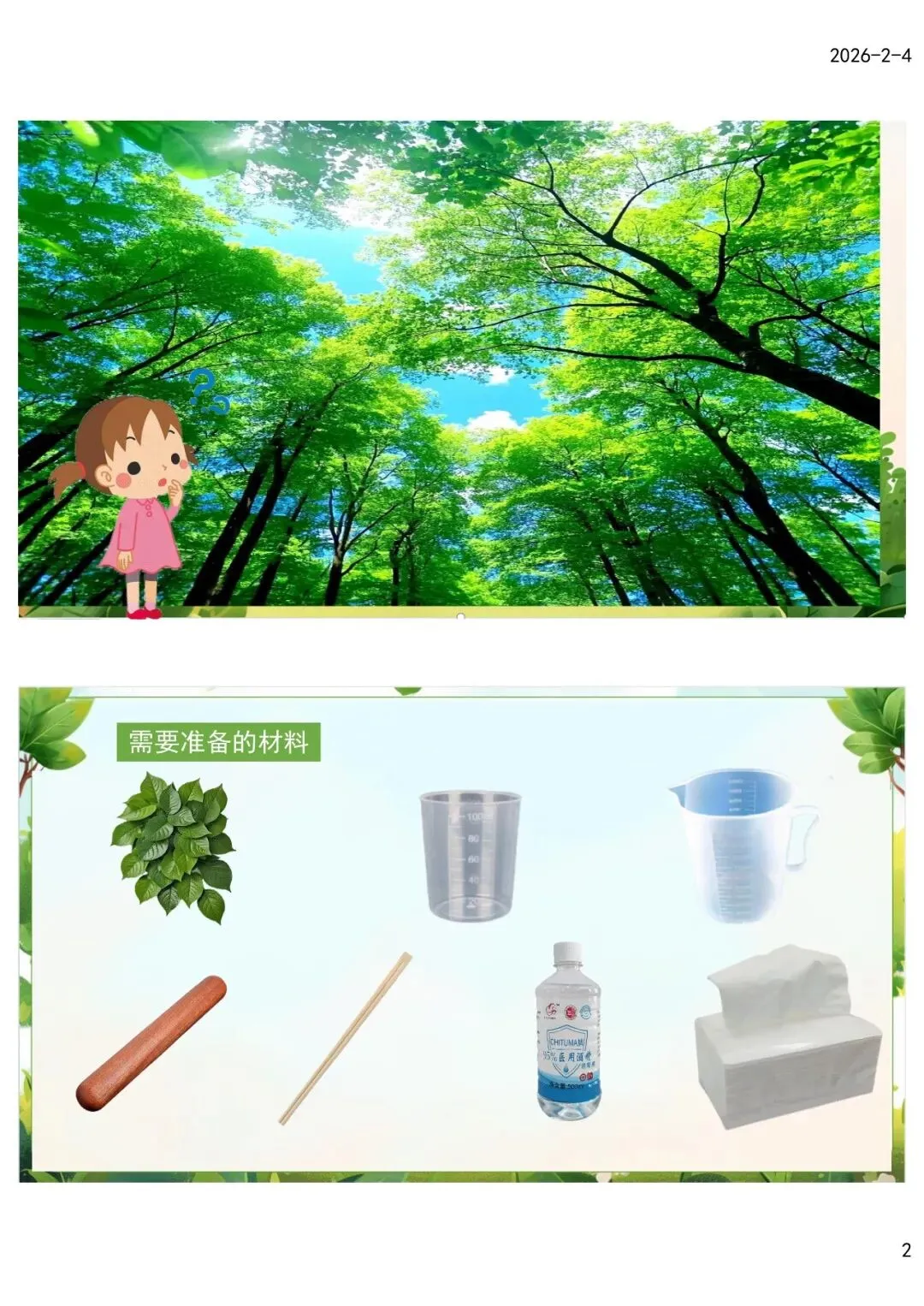 (2)叶绿素提取实验可同时提供酒精、水两种液体给幼儿操作,帮助幼儿感知叶绿素能溶解在酒精中。