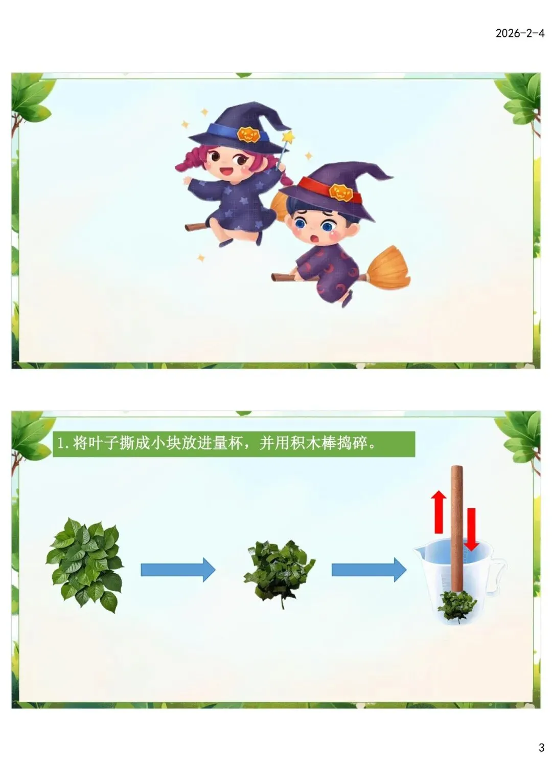 (2)实验过程按照“撕碎叶片—捣碎叶片—加入酒精—静置倾倒”等实验方法设计PPT课件动态示意图,简单易理解,保证幼儿提取叶绿素实验的成功率。