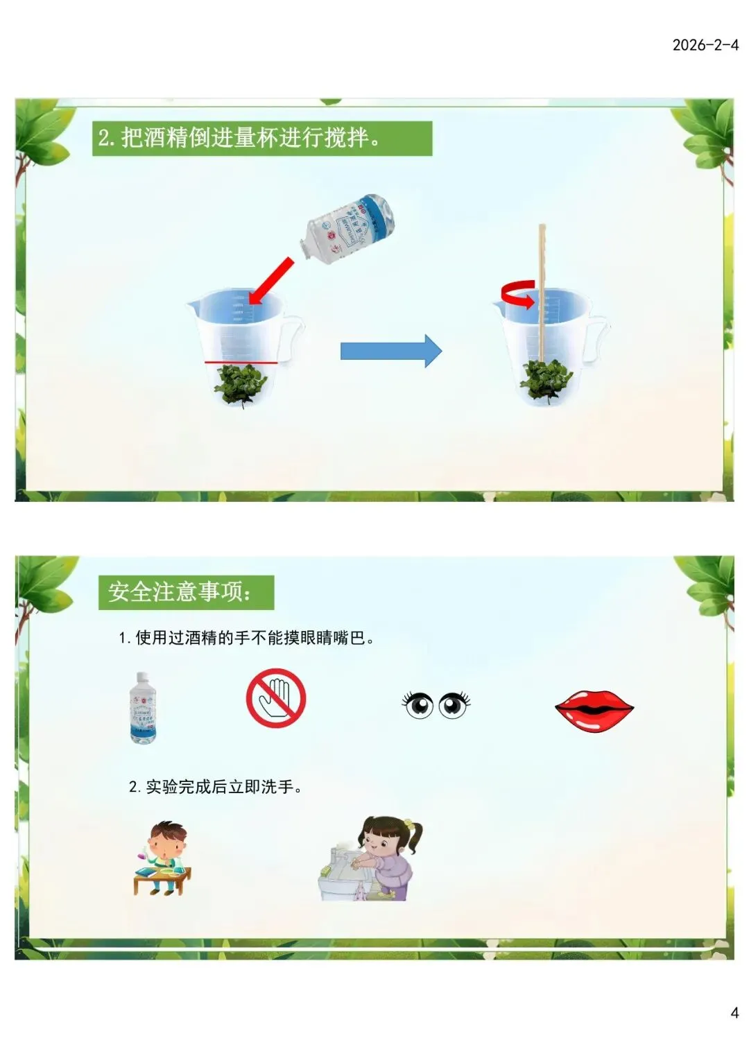 (1)幼儿操作实验引导幼儿仔细观察实验现象环节,如叶片颜色逐渐变浅、酒精慢慢变绿等,可设计利用图画或颜色记录实验变化的方式(杯子里的液体从透明——浅绿——深绿),幼儿观察更仔细,了解更深入(颜色与浸泡时间的关系)。