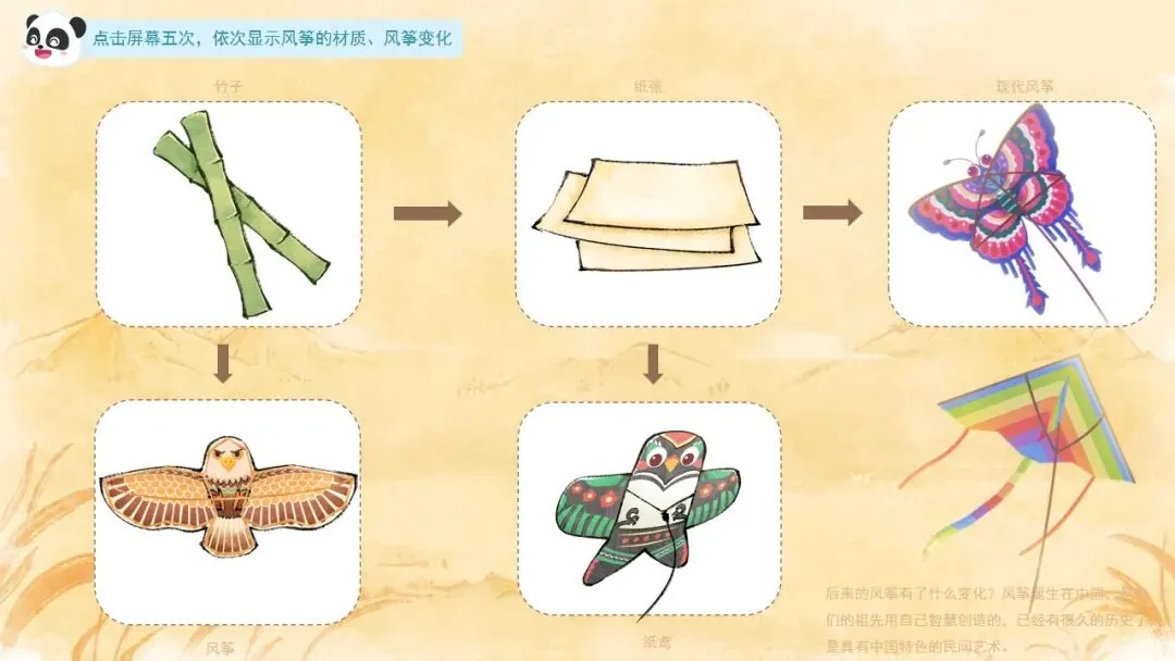初步了解风筝是中国民间手工艺品,风筝上的图案表达了人们的美好愿望和对生活的期待。