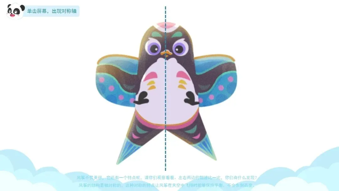 小结:风筝的结构是轴对称的,这种对称的特点让风筝在天空中飞翔时能够保持平衡,不会东倒西歪。