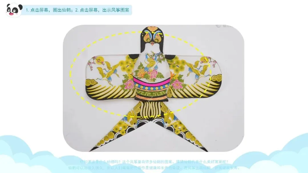 ——这个风筝里有许多仙鹤的图案。猜猜仙鹤代表什么美好寓意呢?