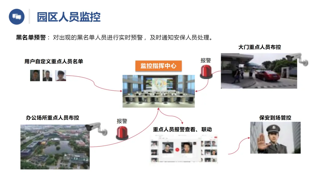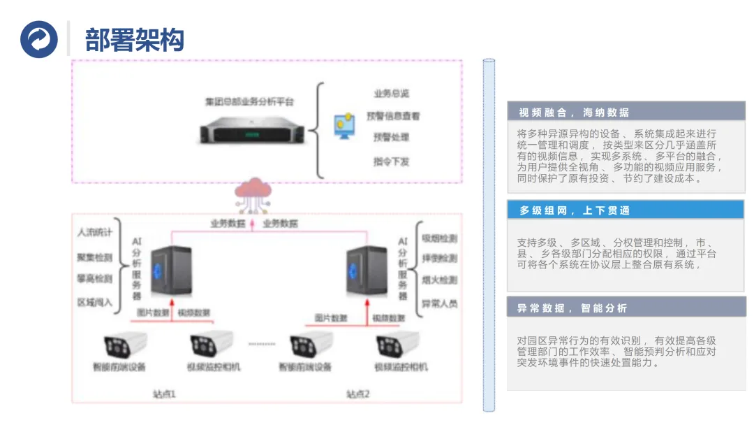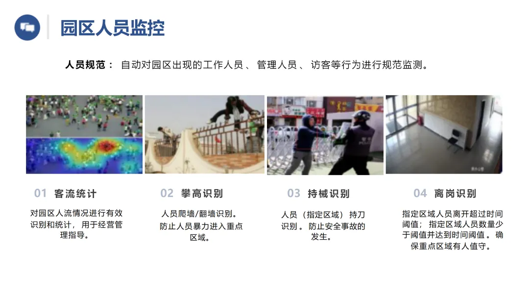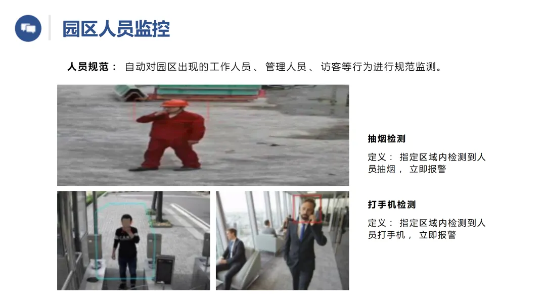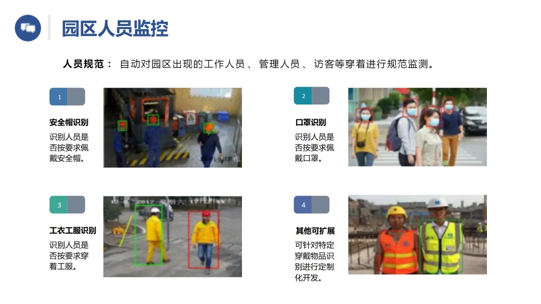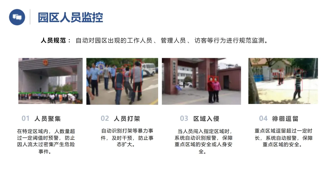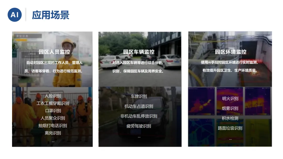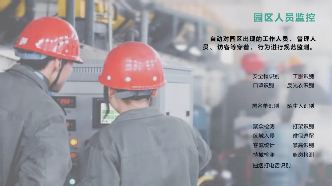 方案充分利旧现有监控设备,兼容主流厂家设备与国标协议,通过AI算法引擎实现人员、车辆、环境三大场景的智能监测。人员监控可识别安全帽佩戴、聚众、离岗等异常行为,车辆监控能完成车牌识别、占道预警、疲劳驾驶检测等任务,环境监控可实时监测明火、烟雾、垃圾堆积等问题。同时,系统支持多级组网与多平台融合,形成“数据接入—智能分析—报警呈现—人工复核—现场处置—总结归纳”的业务闭环,有效解决了传统园区管理分散、效率低下、人工成本高的问题。