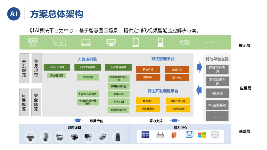 本方案立足智慧园区建设政策导向与行业发展痛点,以视觉AI技术为核心,构建了“基础层—应用层—展示层”的三层架构体系,为园区提供智能化、高效化的管控服务。