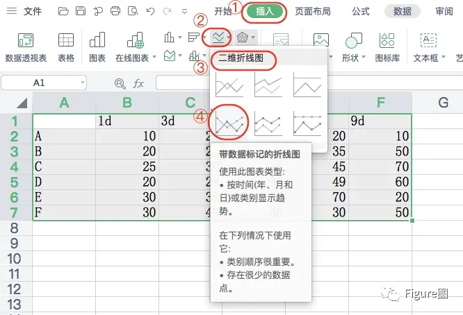2.选中数据,依次点击“插入”→“二维折线图”→“带数据标记的折线图”,插入图表。