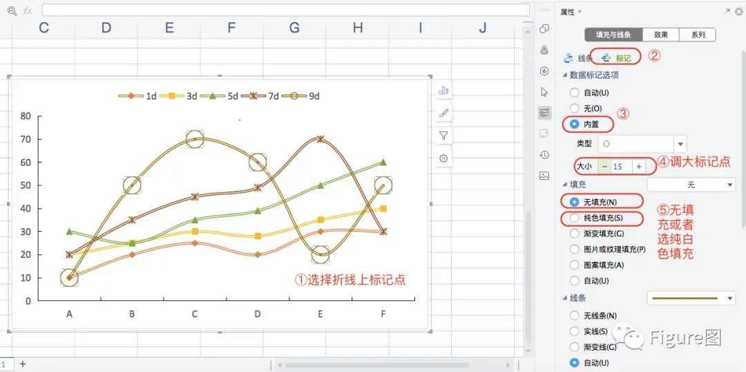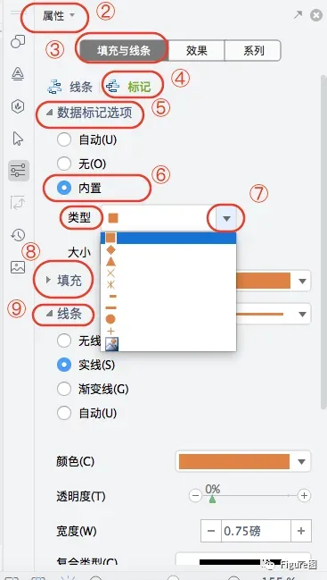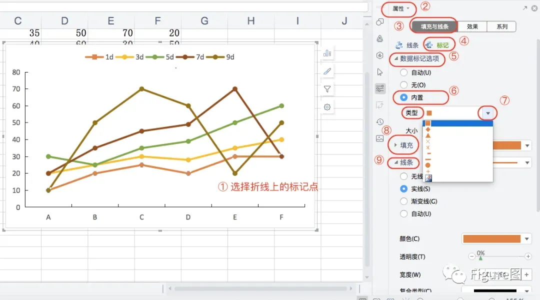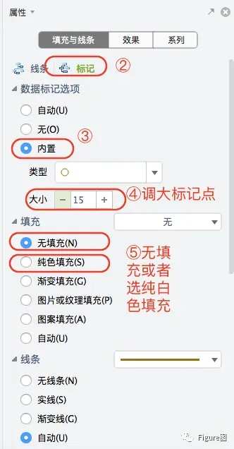 5. 调整折线标记点:选中折线上标记点,通过“属性”→“填充与线条”→“标记”→“数据标记选项”→“内置”→“类型”选择标记点的显示类型,同时通过下面的“填充”和“线条”选项可以对标记点格式调整。(按图示步骤进行)。