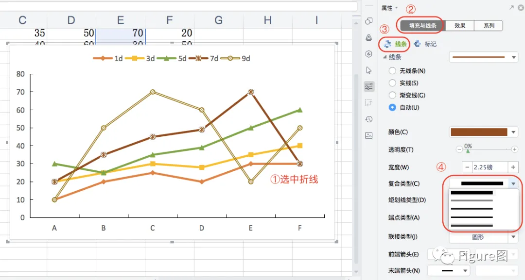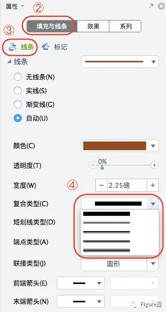 7. 标记点修改后,折线类型亦可修改,选中折线后,通过“属性”→“填充与线条”→“线条”→“复合类型”等选择不同类型线条。