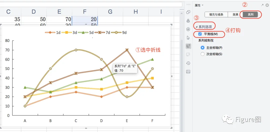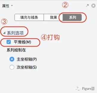 9. 当我们觉得线条太生硬的时候,小编教你如何变成平滑:选中折线后,通过“属性”→“系列”→“系列选项”→“平滑线”勾选。这样折线就变成平滑的过度了。