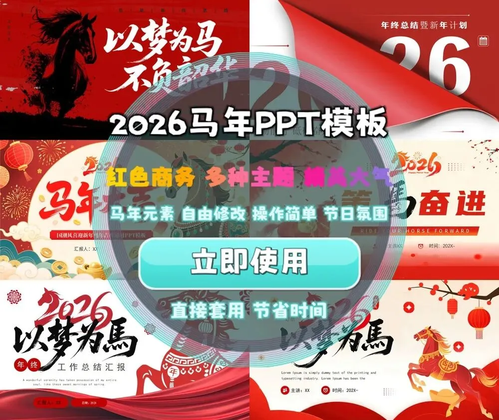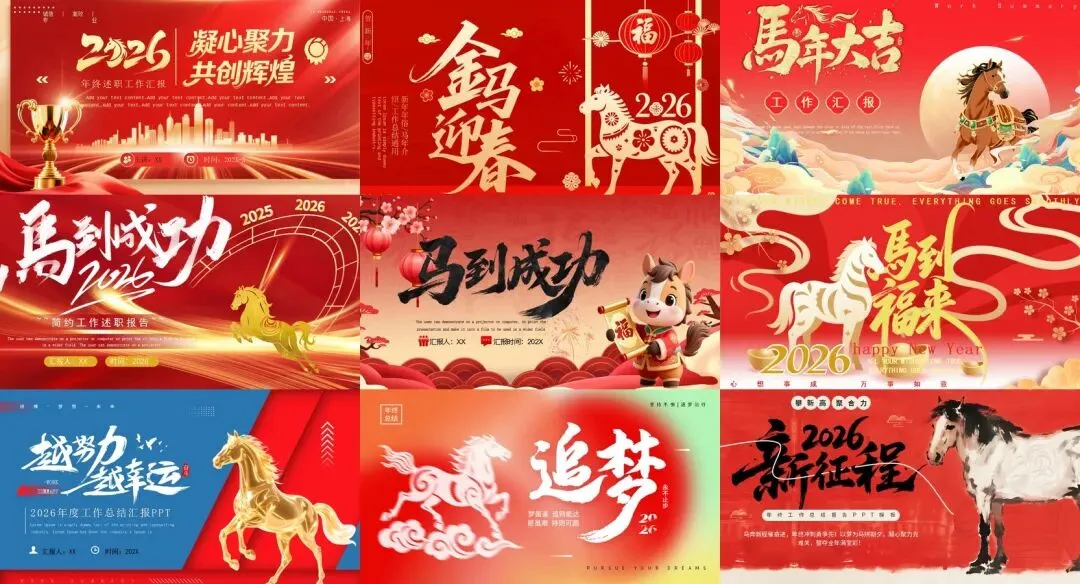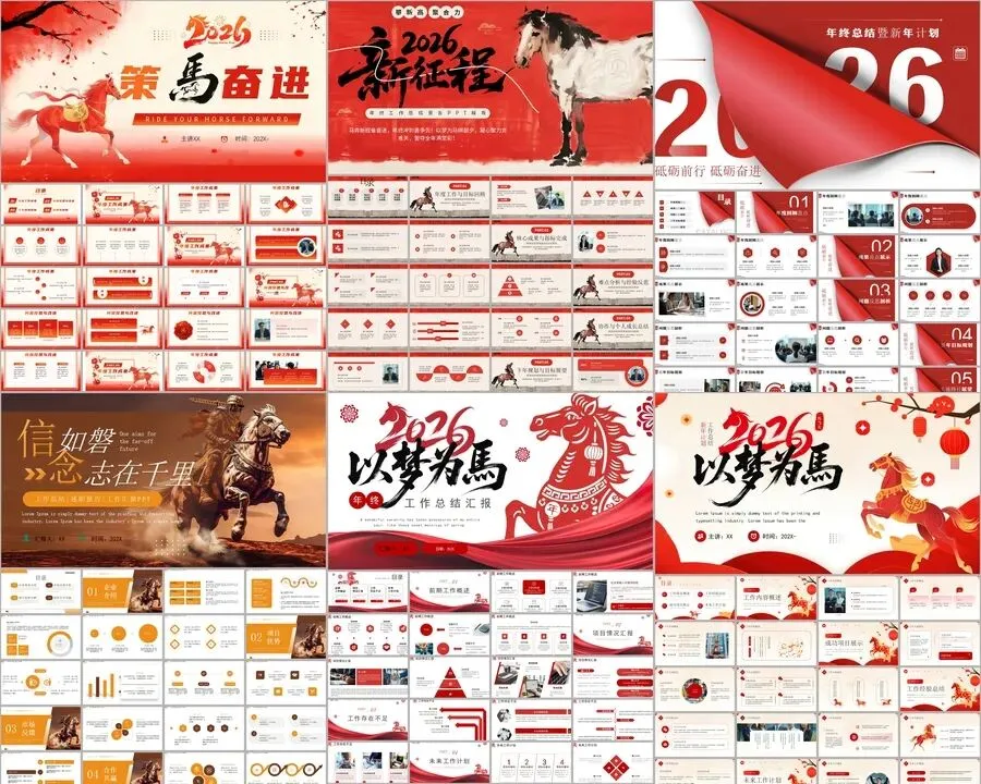 模板以红色为主色调,搭配金色马元素,营造出喜庆而专业的氛围。设计细节丰富,布局合理,能够有效突出内容重点。