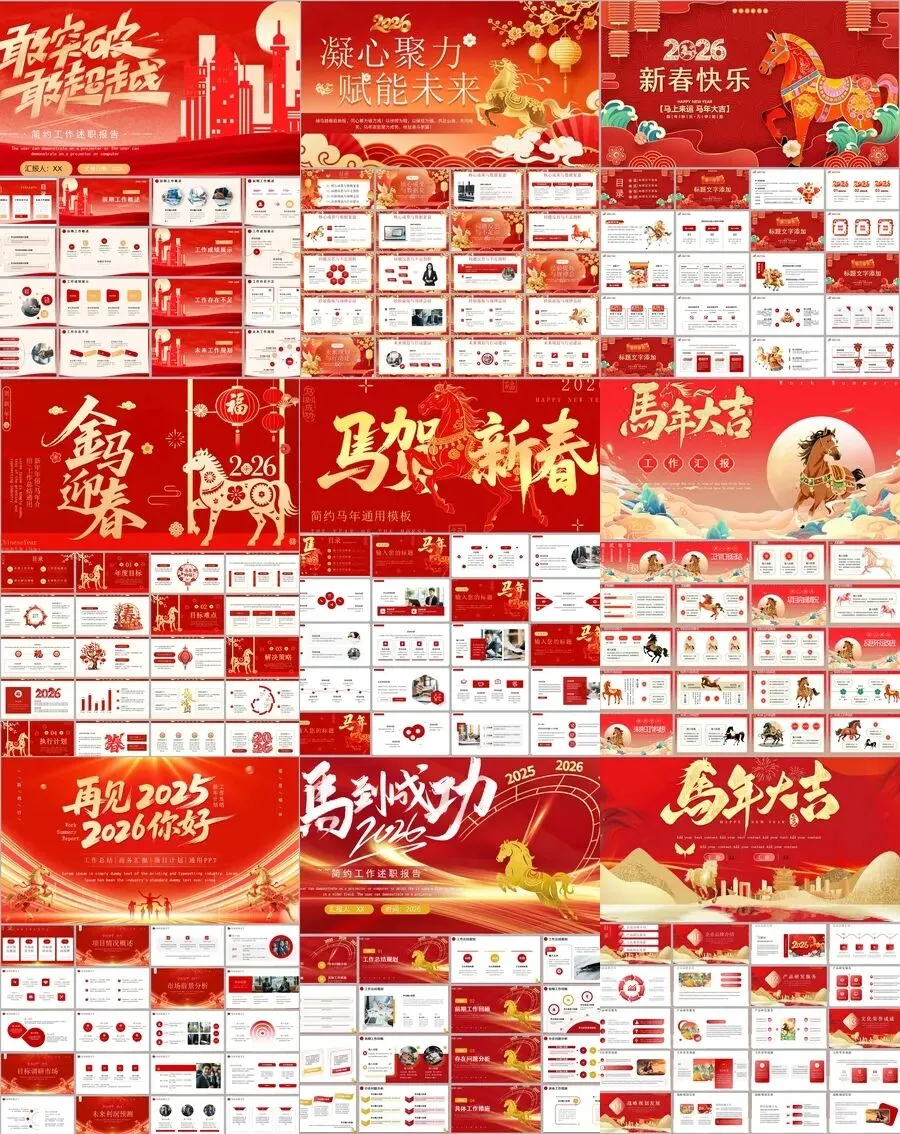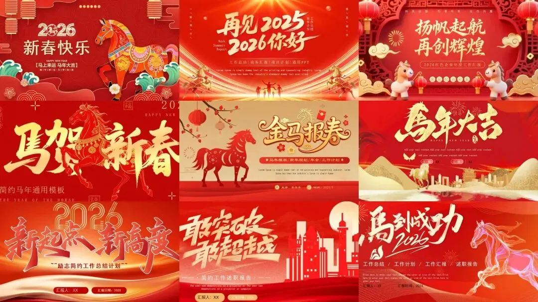 - 包含年终总结、工作汇报、新年计划、年会活动等多种主题模板