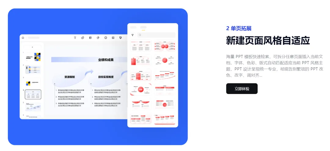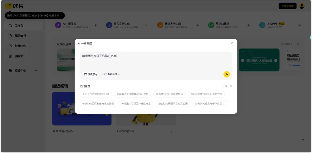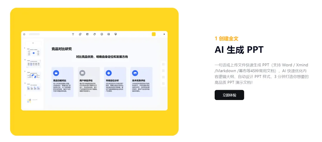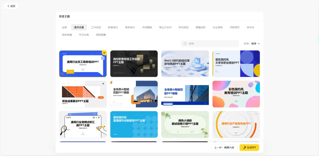 只要输入主题或关键词,AI 自动生成包含逻辑结构、版式设计的 PPT 初稿。大大缩短从空白页到成稿的时间。