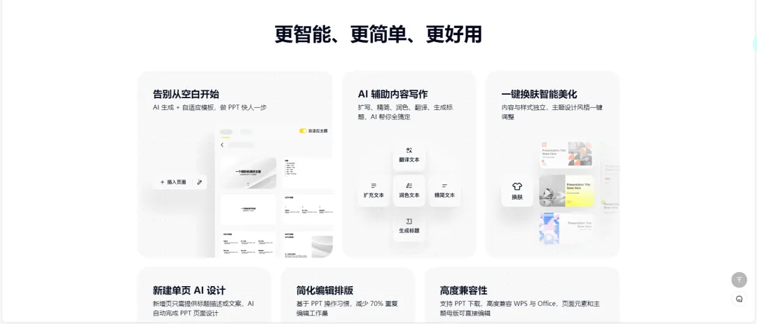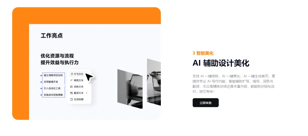 自动排版、AI 换肤、一键美化、智能素材匹配……告别对齐线和色彩表,从视觉设计上直接提高品质。
