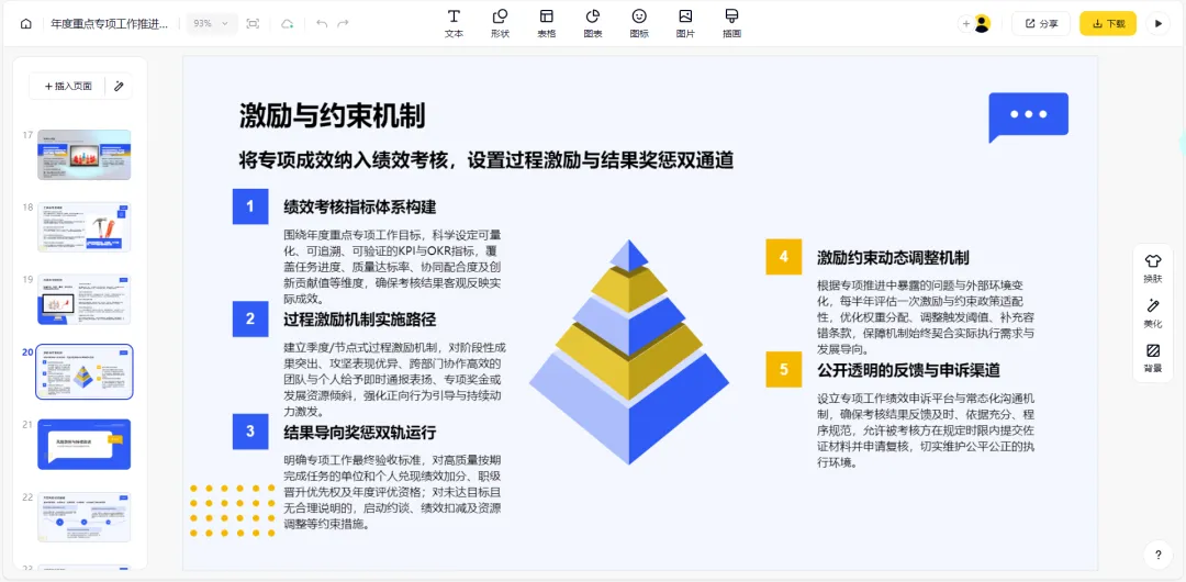 整个过程不到 5 分钟,就能得到一套逻辑完整、视觉统一的 PPT。对于忙碌的职场人来说,这意味着 从枯坐思考 → 结构输出 → 美观呈现的时间缩短 >70%。