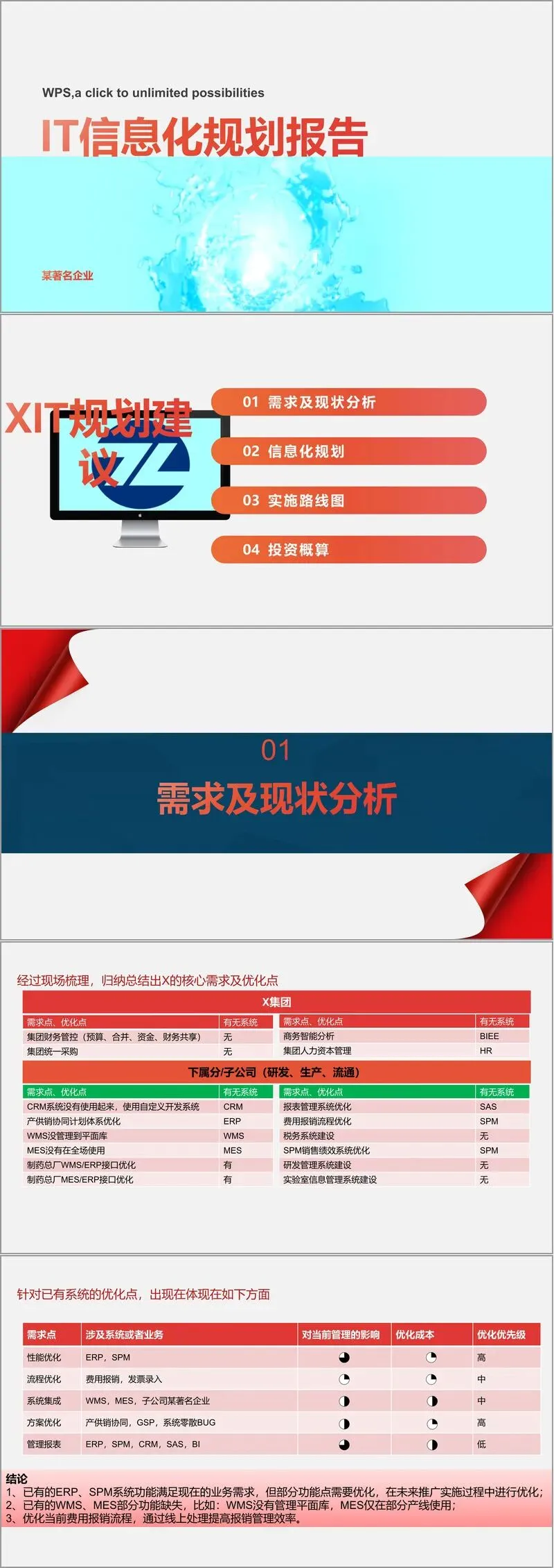 针对已有系统,优化需求主要集中在五个方面:一是性能优化(如ERP、SPM系统响应速度),被列为高优先级;二是流程优化(如费用报销流程)和系统集成(如WMS、MES与核心业务系统的无缝对接),属于中等优先级;三是方案优化(如产供销协同计划逻辑),同样具有高优先级;四是管理报表的完善,目前优先级相对较低。结论明确指出,现有ERP、SPM等系统框架已能满足基本业务需求,但需在推广中持续优化功能点,并重点补齐缺失的系统功能,构建从集团管控到运营执行的完整信息化体系。