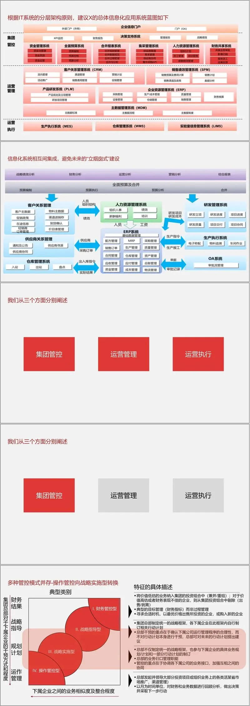 基于集团的业态特点(研发、生产、流通)和管控模式(正从操作型向战略实施型转变),方案提出了分层设计的总体应用系统架构,强调系统间集成,避免形成新的“信息孤岛”。该架构可划分为三个层次: