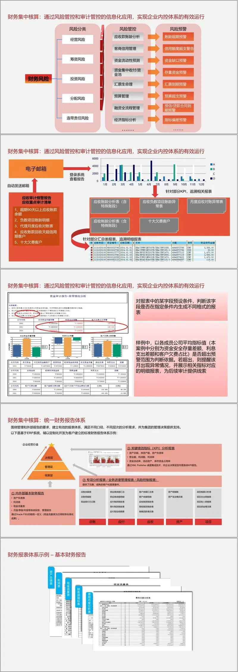 资金集中管理:旨在实现资金核算与业务一体化、银企直联,通过资金计划、结算中心和风险监控,发挥资金规模效益,降低管理风险。