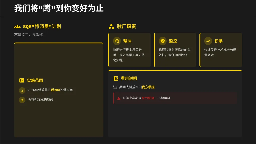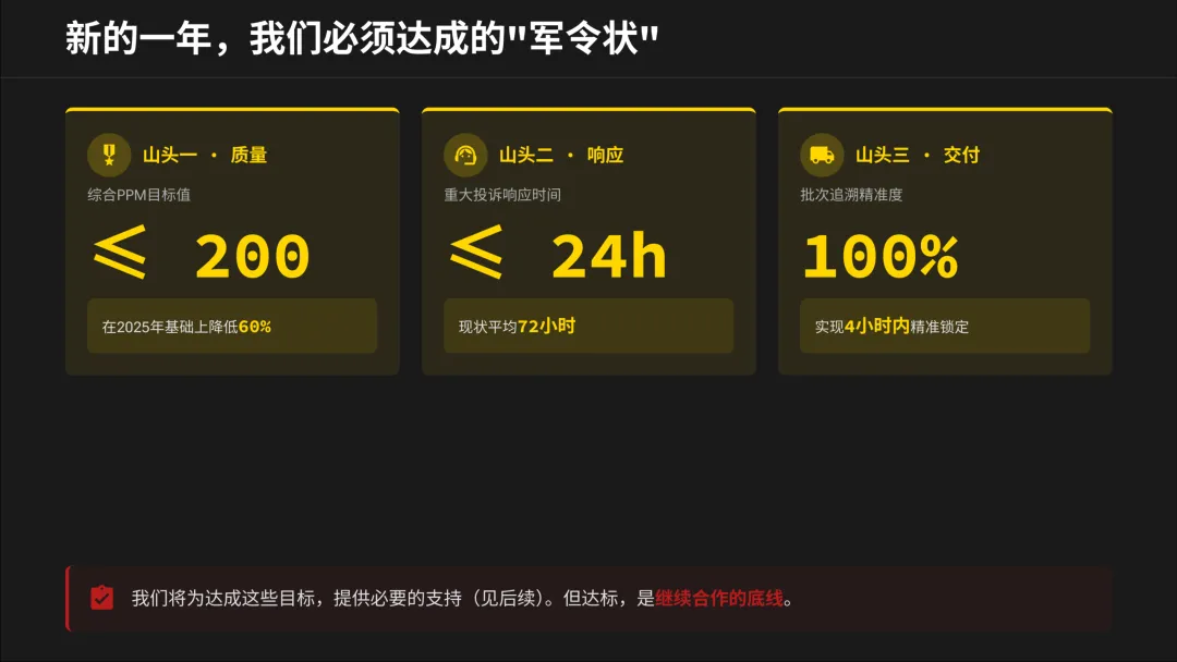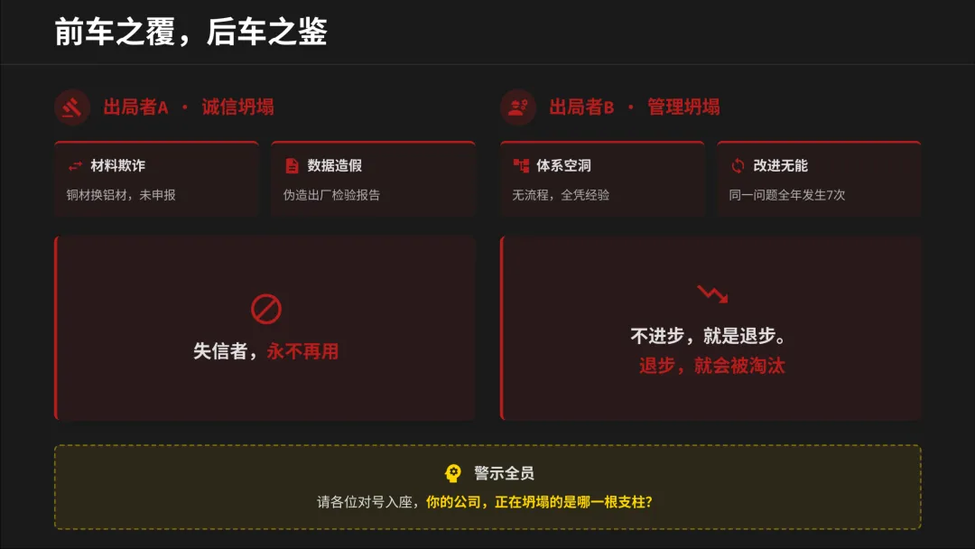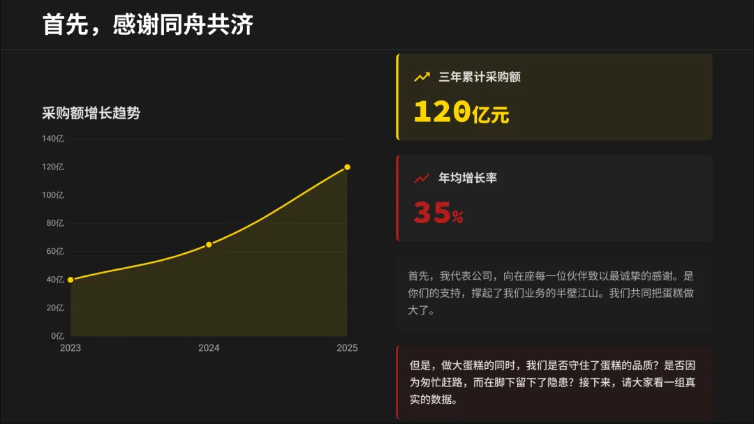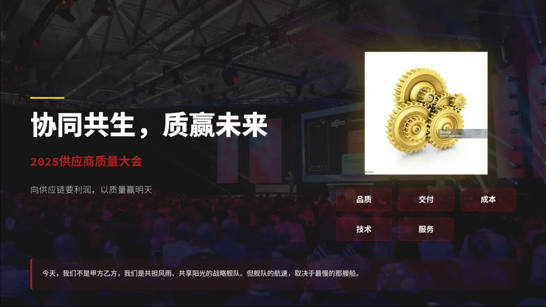 刚开完今年的供应商大会,心情有些复杂。看着PPT上“协同共生,质赢未来”的标语,再对比那些触目惊心的损失数据和事故照片,我想和大家掏心窝子聊聊。