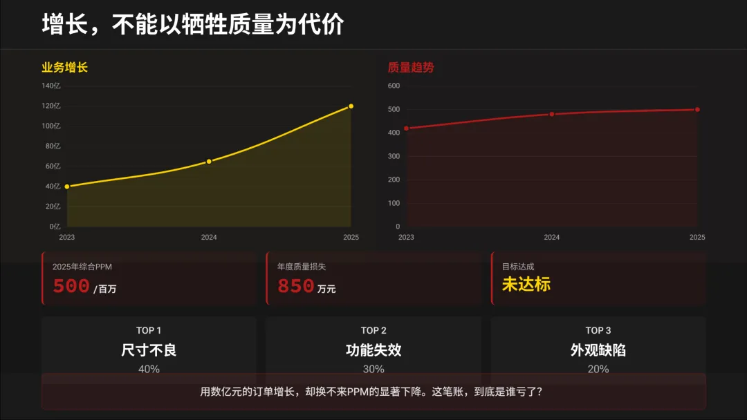 这意味着什么?我们用了数亿元的订单增长,去喂养一个巨大的“质量黑洞”。PPM(百万件不良率)没有显著下降,说明问题不是变少了,而是被增长的表象掩盖了,或者在客户端爆发了。