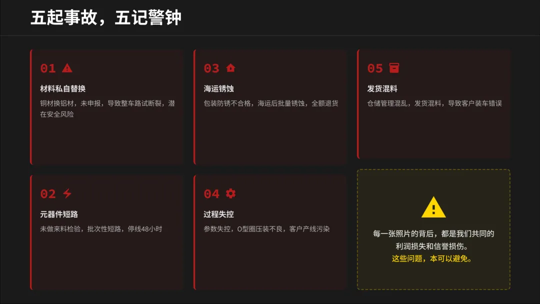 再看那“五记警钟”:从材料欺诈、数据造假,到过程失控、管理混乱。每一张事故照片背后,都是停线、退货、客户投诉,最终都折算成了我们双方账本上的赤字和信誉表上的污点。