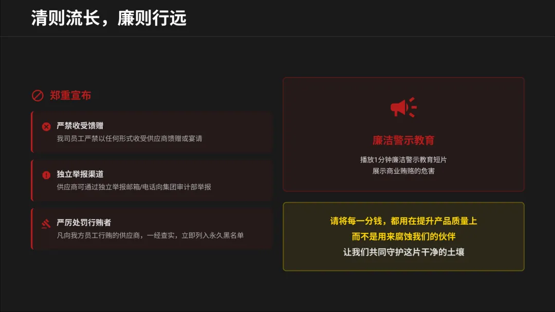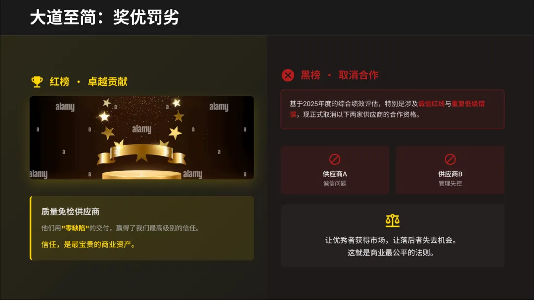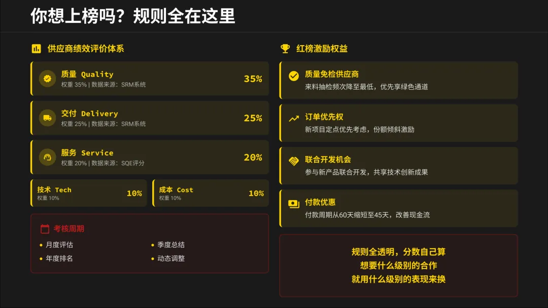 商业世界,奖优罚劣是最公平的法则。红榜供应商获得免检信任和更多订单,黑榜供应商直接被取消资格。未来,资源只会向能一起跑向未来的伙伴倾斜。你的选择决定了你的位置。